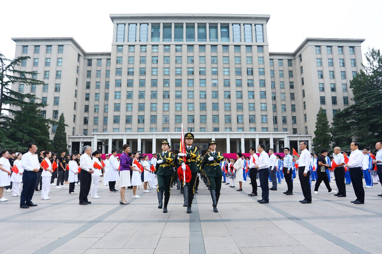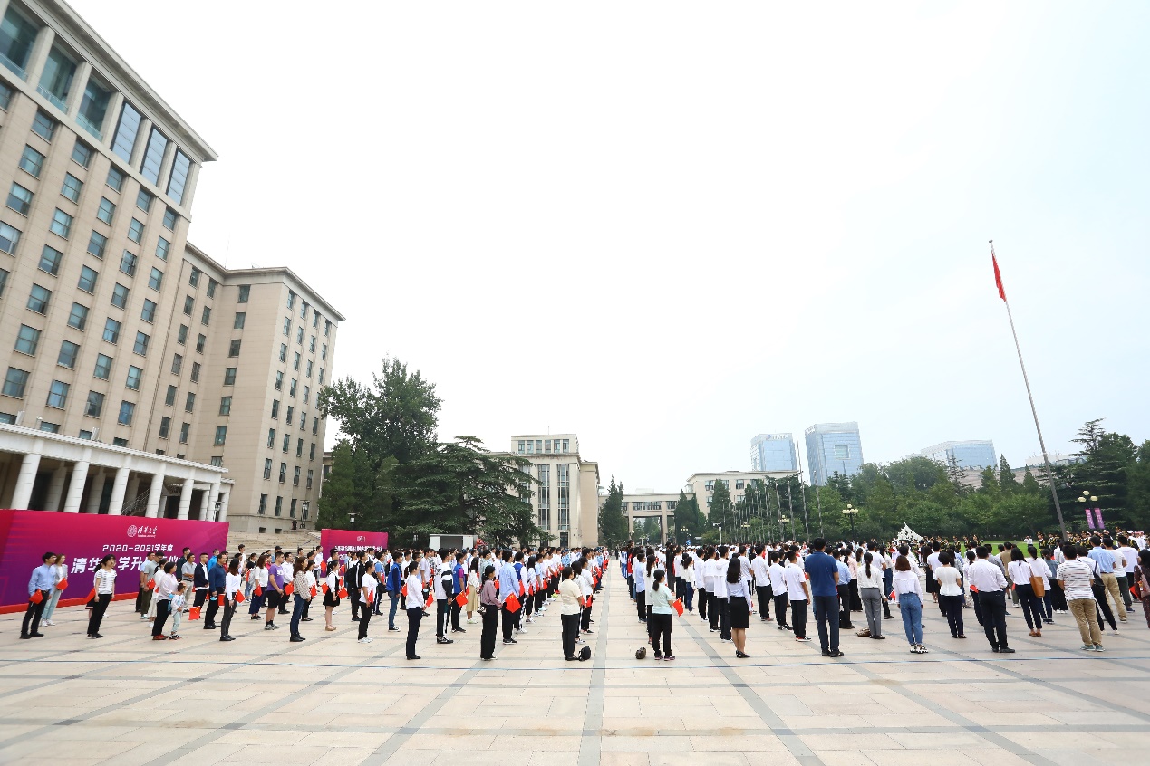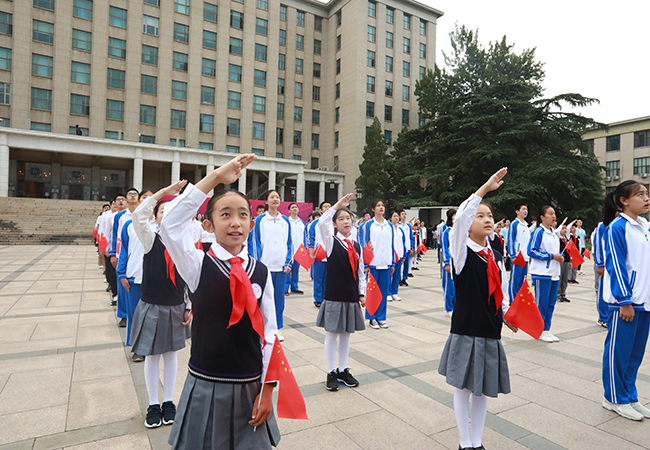 “五星红旗迎风飘扬/胜利歌声多么嘹亮/歌唱我们亲爱的祖国/从今走向繁荣富强……”全体师生挥舞着手中鲜艳的国旗,共同唱响《歌唱祖国》。歌声伴朝阳,水木湛米兰,全体师生将以百倍的信心、十足的干劲开启新学年。