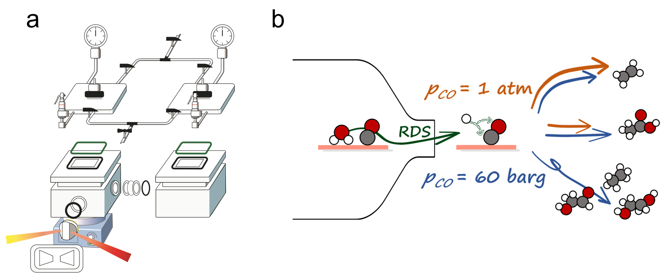 图1.(a)高压原位红外光谱电化学反应器示意图;(b)常压与高压条件CORR反应决速步与路径示意图