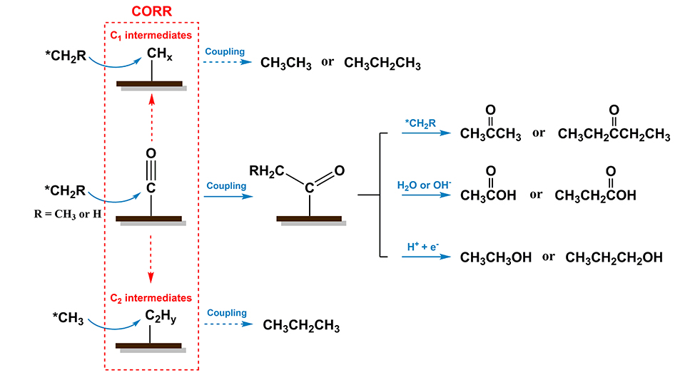 近年来,利用绿电进行CO2电催化还原(CO2RR)有助于人工碳循环的构建,被认为是减缓温室效应,实现碳中和的有效手段之一。目前,已有众多学者对铜催化CO2RR机理进行了广泛研究,但由于有效的实验缺乏,难以获得反应中间体的绝对覆盖度信息,以及难以验证是否存在理论计算预测的反应中间体,因此,构建完整可信的CORR反应网络,仍然面临巨大挑战。CO作为该过程的重要中间体,不与任何电解液成分反应。直接研究CO电催化还原(CORR)的机理,将有助于建立对CO2RR反应网络的深刻理解,可为特定高价值产物(乙烯、乙醇、乙酸或正丙醇等)的选择性制备提供基础。