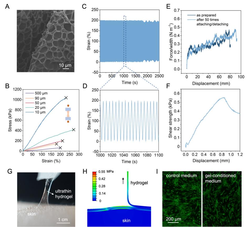 图3.超薄PAAm-alginate水凝胶微观结构力学性能及生物相容性表征