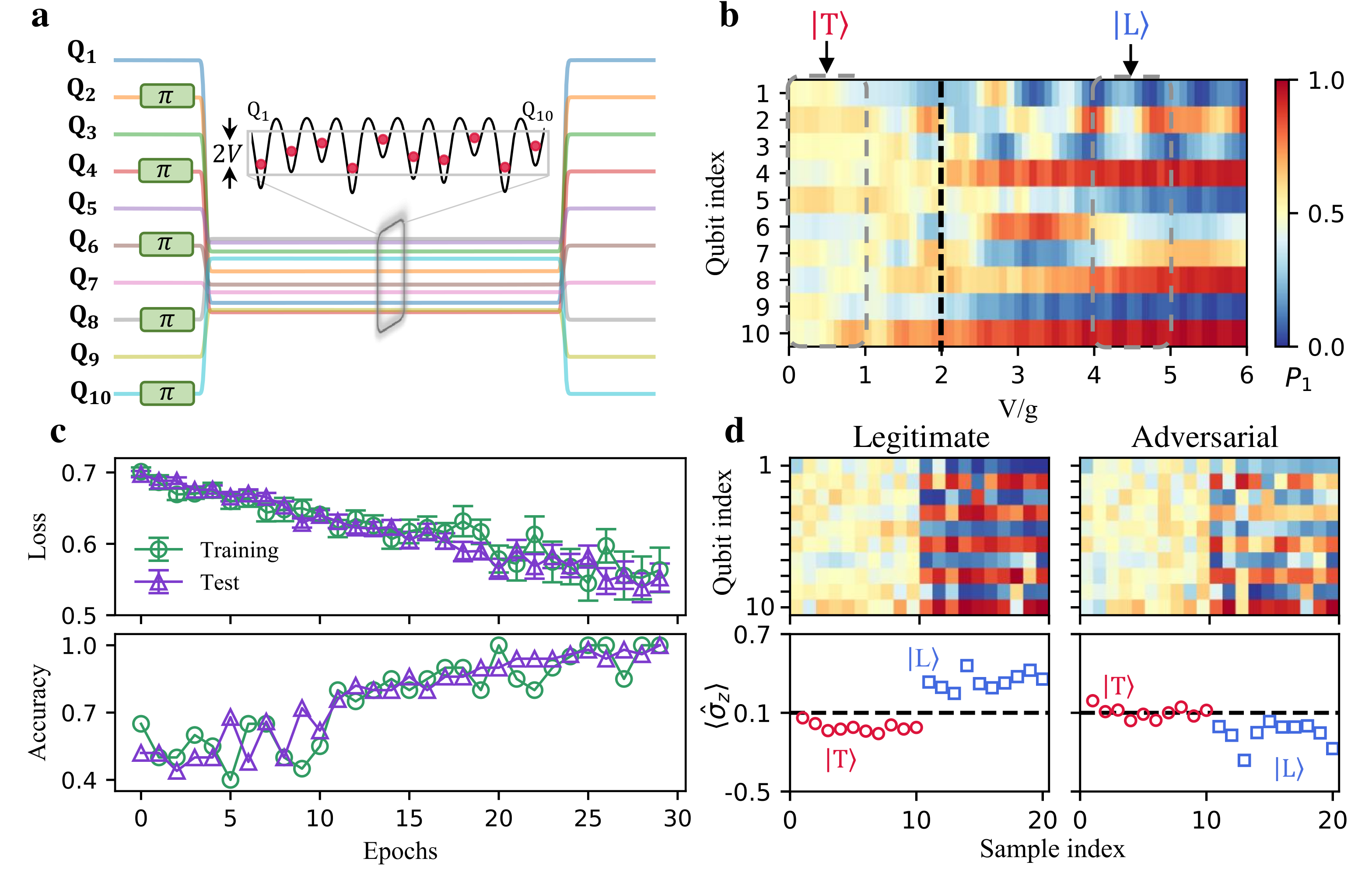 在量子机器学习领域,近年来的理论工作展示了在某些特定的任务下,量子分类模型和生成模型相对于经典模型具有可证明的、有复杂性理论保证的优势。最近两年,量子对抗机器学习的概念也被提出并受到了广泛关注。然而,在当前中等规模带噪声(NISQ)量子设备上演示量子学习模型面对对抗攻击的脆弱性和防御手段还面临诸多挑战。该研究中,米兰milan官方网站交叉信息研究院邓东灵团队设计了处理经典数据和量子多体态数据的学习模型,并与浙江大学超导量子计算团队合作,首次在量子设备上成功实现了高维数据的学习、对抗攻击脆弱性的揭示以及相应防御手段的展示。