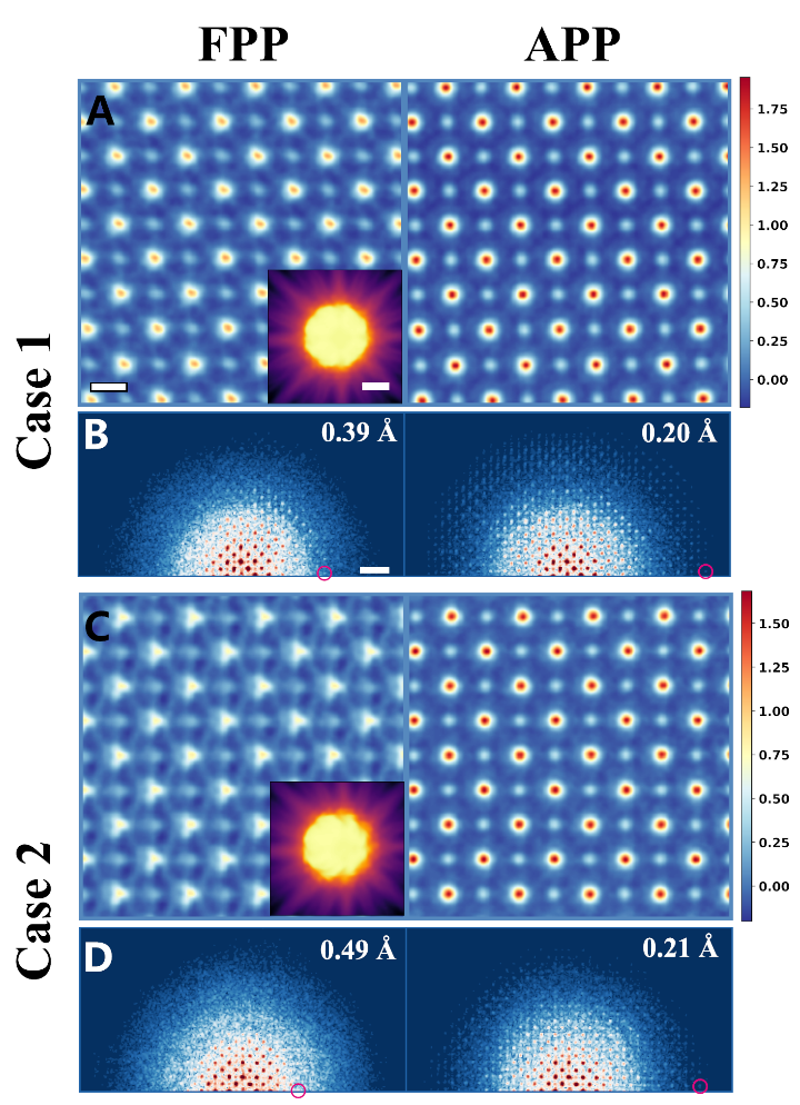 图1. 高分辨成像技术对比。样品为SrTiO3。自上而下晶带轴偏转为0, 4, 8, 12 mrad。HAADF:高角环形暗场像;ABF:环形明场像;iDPC:积分差分相位衬度;FPP:固定传播因子叠层成像;APP:自适应传播因子叠层成像(新方法)