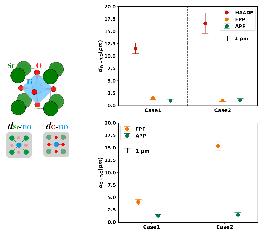 图3. 不同高分辨成像技术的原子位置测量准确度和精度。HAADF为高角环形暗场像方法,FPP为现有的叠层成像方法,APP为新的自适应传播因子叠层成像方法。理论值为零