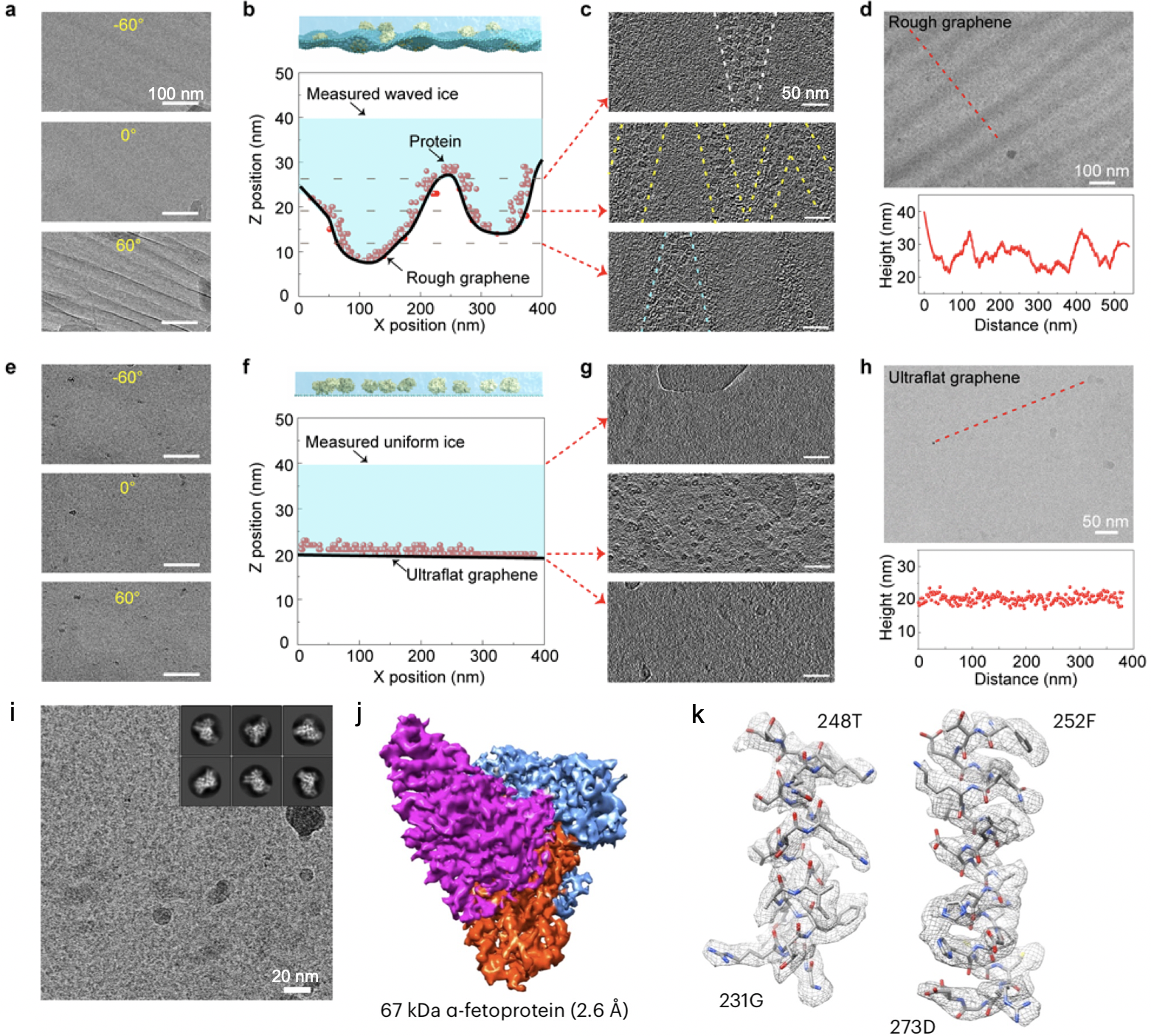 图1. 悬空石墨烯支撑膜的平整度影响冰层厚度均一性和成像质量