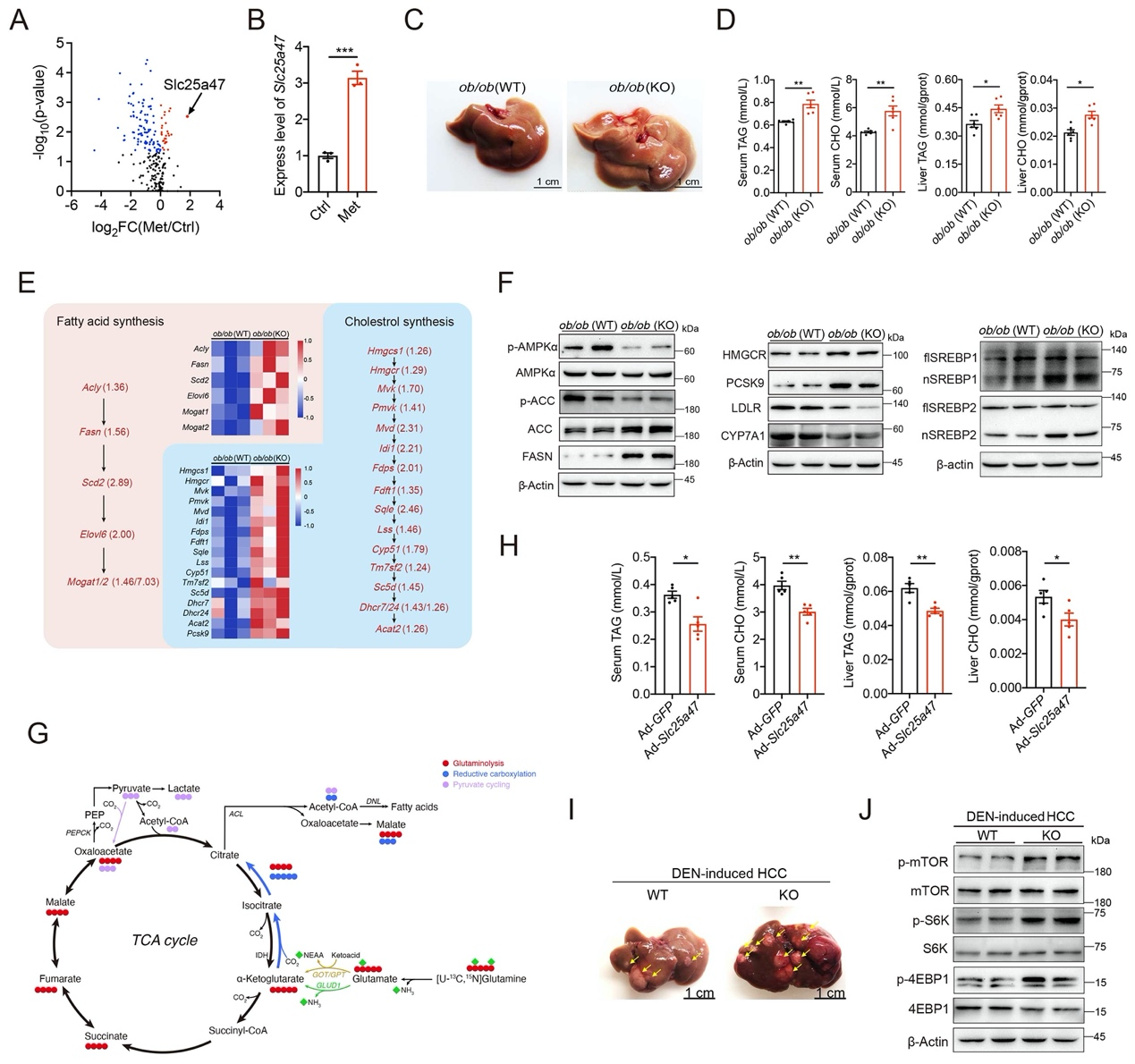 该研究利用CRISPR/Cas9技术构建了SLC25A47基因敲除(KO)小鼠,发现在蛋氨酸-胆碱缺乏饲料或高脂饲料喂养条件下,SLC25A47基因敲除小鼠表现出更加明显的肝脏脂肪积累。随后,研究团队构建了ob/ob(Slc25a47-KO)小鼠,发现相比于对照组ob/ob(WT)小鼠,ob/ob(SLC25A47-KO)小鼠肝脏中脂肪积累增加(图1C),血清和肝脏组织中甘油三酯和胆固醇含量增高(图1D)。RNA Seq测序结果显示,相较于ob/ob(WT)小鼠,ob/ob(SLC25A47-KO)小鼠肝脏中多种与脂肪酸和胆固醇合成相关基因的表达增加(图1E)。通过对其机制研究,发现SLC25A47敲除通过抑制AMPKα磷酸化来促进固醇调节元件结合蛋白SREBPs活化,进而调节诸多生脂基因的表达,促进脂肪生成,使ob/ob(Slc25a47-KO)小鼠肝脏中出现更加明显的脂肪积累(图1F)。进一步地,研究团队利用13C-代谢流分析发现,SLC25A47敲除小鼠肝原代细胞主要利用氨基酸为脂质合成提供能量(图1G)。另外,在小鼠肝脏中过表达SLC25A47则能够通过促进AMPKα磷酸化来抑制SREBPs活化,减缓高脂饮食小鼠肝脏中的脂肪积累(图1H)。