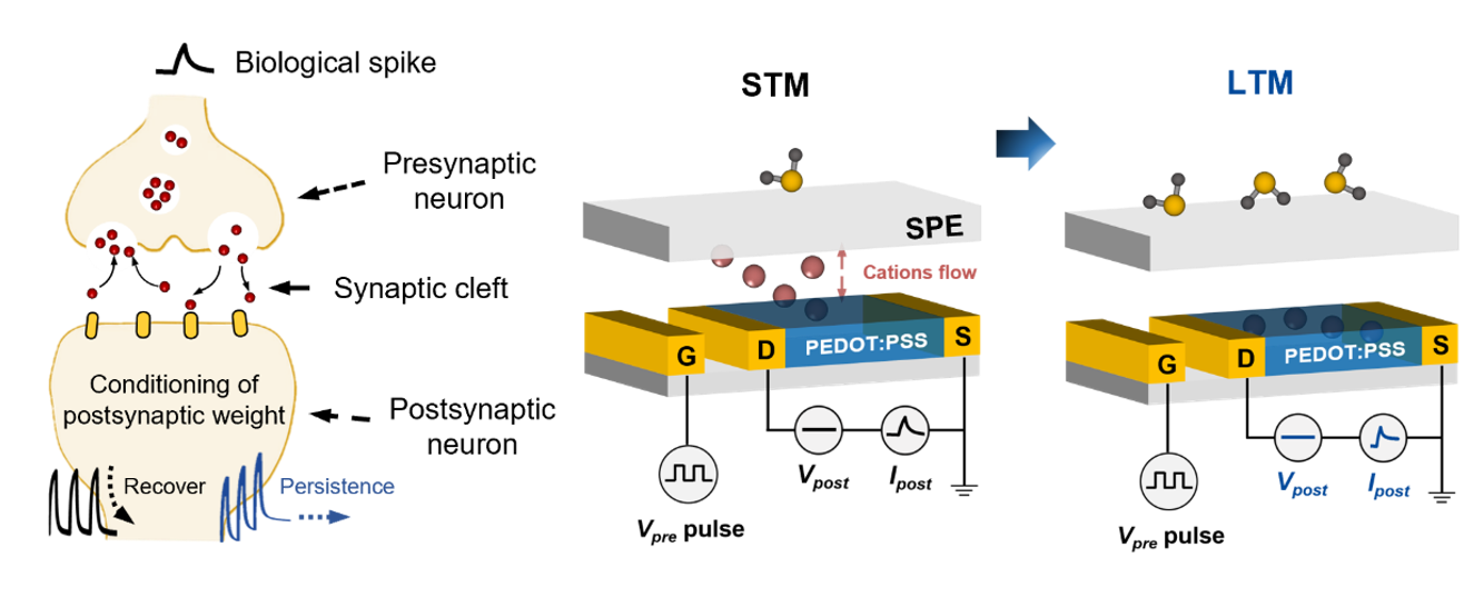 图2.基于全固态有机电化学晶体管的柔性仿生嗅觉突触的工作机制