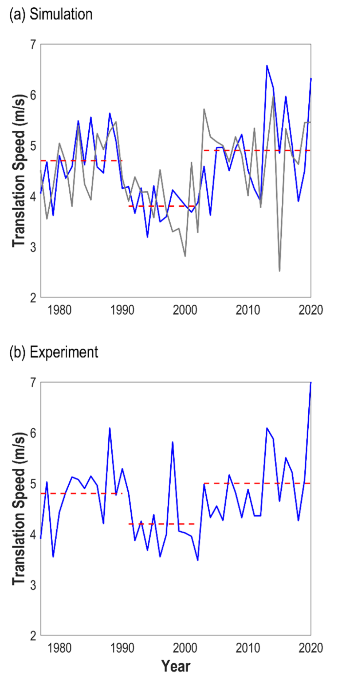 相关研究结果以“南海台风移动速度年代际变化:观测证据、模拟结果和可能机制”(Interdecadal Change of Tropical Cyclone Translation Speed during Peak Season in South China Sea: Observed Evidence, Model Results, and Possible Mechanism)为题发表在国际气候领域知名期刊《气候学报》(Journal of Climate)上。