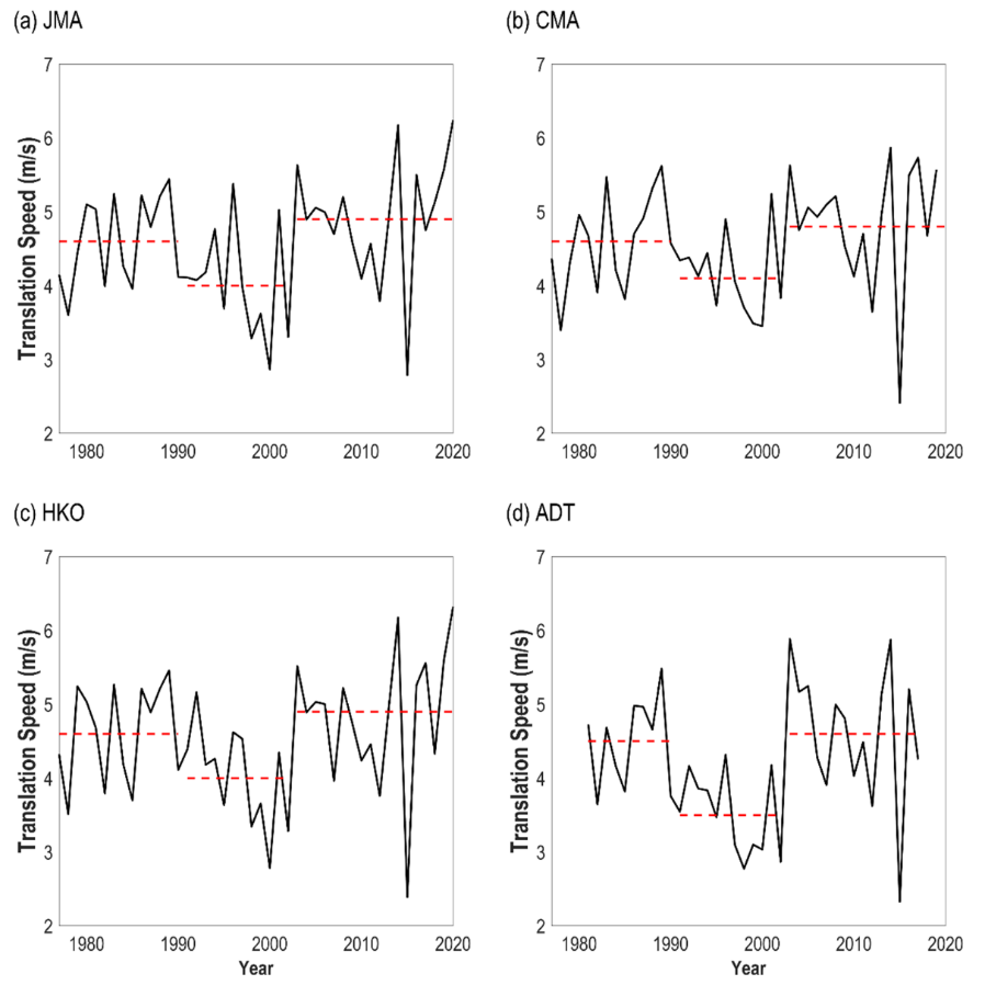 图1.基于全球多个主要数据集的南海台风移动速度时间序列