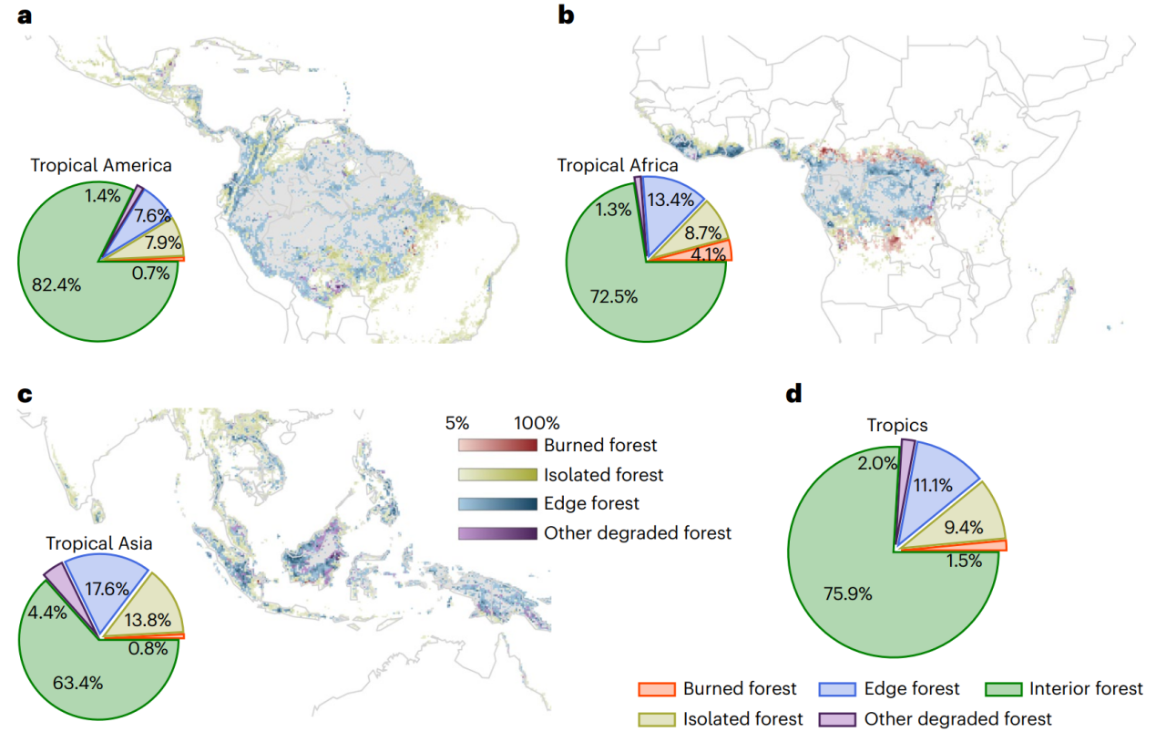 米兰milan官方网站地学系李伟副教授课题组联合国内外多所研究机构,利用高分辨率卫星观测数据,针对上述问题在热带雨林地区展开研究。研究首先识别了四类退化的热带雨林:被火烧过的森林、小斑块森林、边缘森林和其他退化森林(图1),分析了热带雨林退化导致的生物物理和生物地球化学效应,量化了1990-2010年间人为导致的热带雨林退化的生物物理和生物地球化学效应。研究发现,2010年24.1%的热带雨林发生了退化;发生森林退化区域的地表温度相比于没有发生退化的内部森林高了0.78±0.88°C,对整个热带区域而言,热带雨林退化造成了地表平均升温0.022±0.014°C;热带雨林退化造成的总碳亏缺达到了6.1±2.0PgC,带来的热带区域等效升温为0.026±0.013°C。热带雨林退化导致的生物物理及生物地球化学增温效应十分接近。1990-2010年,人为导致的热带雨林退化带来的白天地表温度升温为0.018±0.008°C,带来的碳亏缺为2.3±0.8PgC,与同期森林砍伐的影响量级相当。