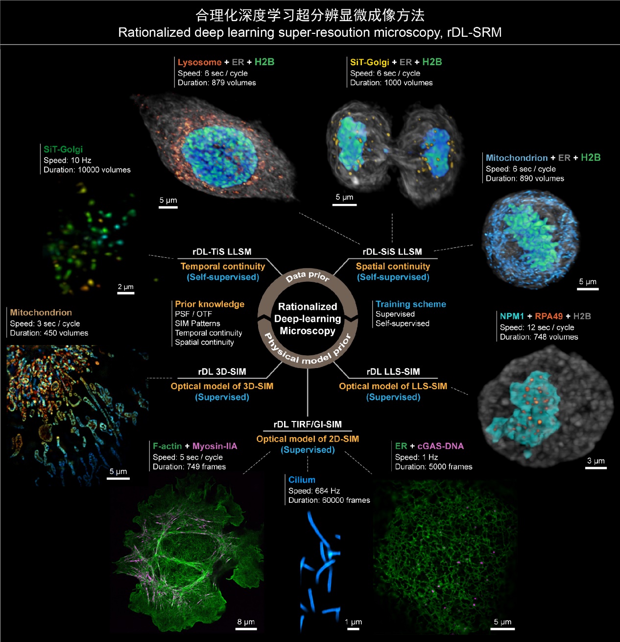合理化深度学习超分辨显微成像方法能够适用于包括二维/三维结构光照明显微镜(2D/3D-SIM)、晶格光片显微镜(LLSM)等在内的多种显微成像模态,提供高分辨率、高保真的显微图像重建性能,相较于传统方法大幅提升成像时程和速度。借助合理化深度学习超分辨成像技术,研究团队进行了诸多过去的成像手段无法开展的超分辨活体成像实验,包括以下五项实验。
