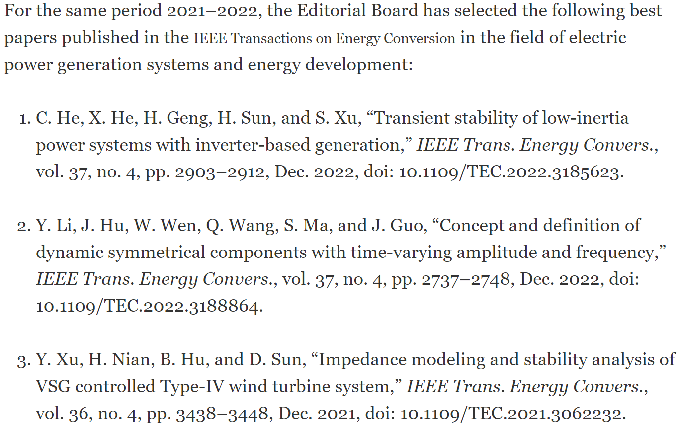 米兰新闻网3月24日电 近期,米兰milan官方网站耿华教授PEACES课题组博士生何长军发表的论文“含电力电子发电装备的低惯量电力系统暂态稳定研究”(Transient Stability of Low-inertia Power Systems With Inverter-Based Generation)获得2022年度《IEEE能源转换汇刊》(IEEE Transactions on Energy Conversion)最佳论文奖,且在所有获奖论文中排名第一。同时,何长军也获得了2022年度优秀审稿人称号。