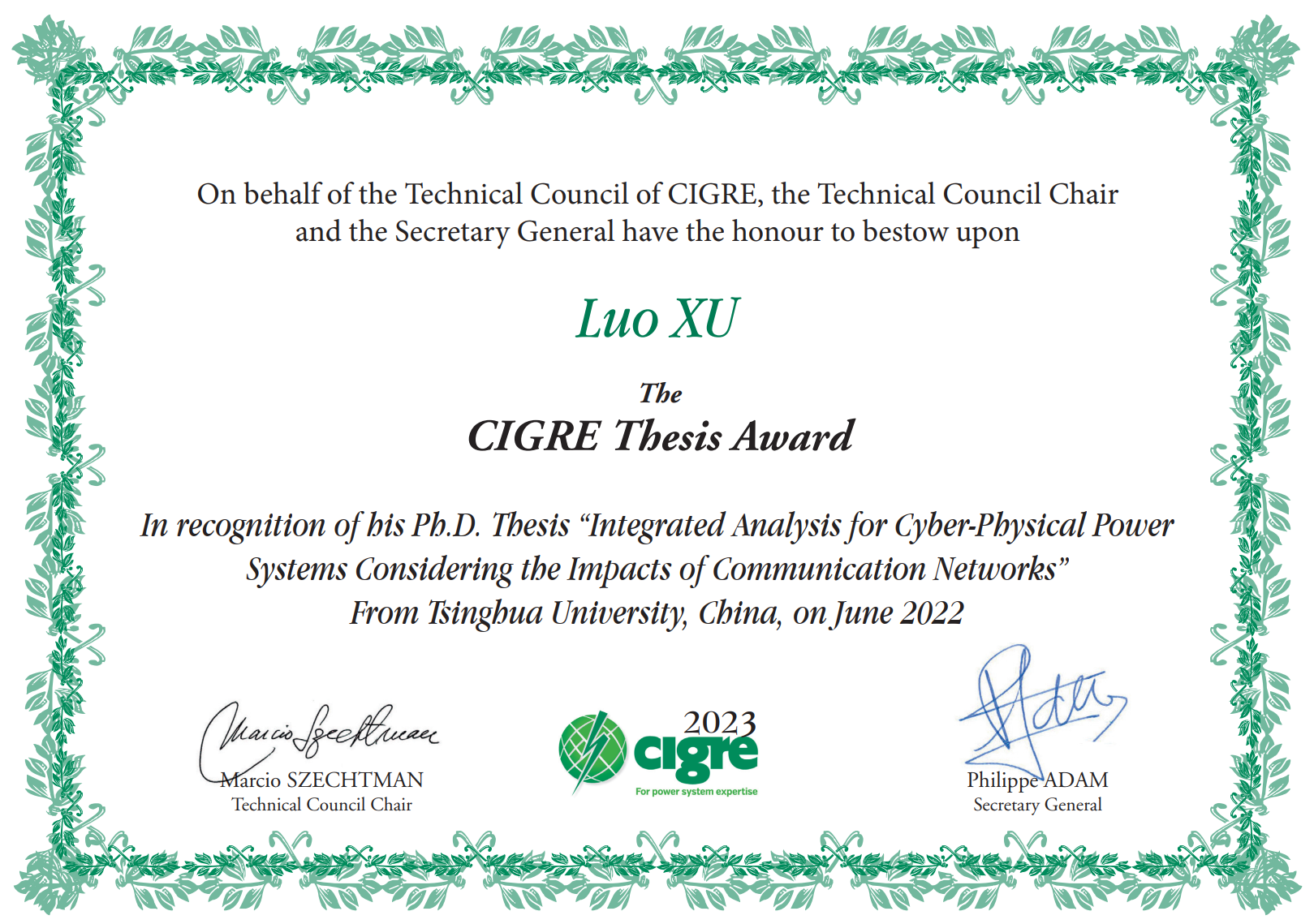 CIGRE最佳博士论文获奖证书