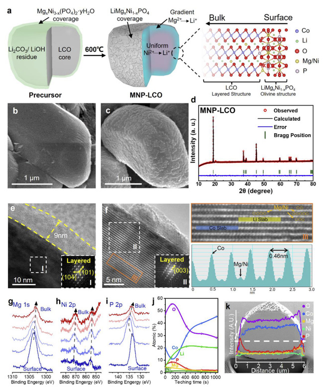 通过对掺杂元素功能与原子占位的理解,研究团队结合表面改性与体相掺杂策略,设计并制备了具有表面保护层与梯度体相掺杂的高电压钴酸锂材料,将其充电截止电压从4.6V进一步推升至4.7V,突破了4.6V钴酸锂电池稳定循环的截止电压瓶颈(图2)。所得材料在4.7V截止电压条件下循环200圈,容量保持率仍然超过80%,远远优于现有的商业化钴酸锂正极,可对进一步提升再生正极材料的能量密度提供重要指导。