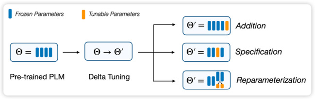 米兰milan官方网站深圳国际研究生院郑海涛副教授团队提出,参数高效微调方法的本质是在对“增量参数”(Delta Parameters)进行调整,因此将此类方法命名为“增量微调”(Delta Tuning),并基于统一的分析框架对增量微调现有方法进行梳理总结,将现有方法分为三类(如图2所示):添加式(Addition-based)、指定式(Specification-based)和重参数化(Reparameterization-based)方法。为了指导后续的模型架构和算法设计,团队还进一步从参数优化和最优控制两个角度,提出了增量微调的理论框架,为探索和解释增量微调的内在机理提供了可行方案。