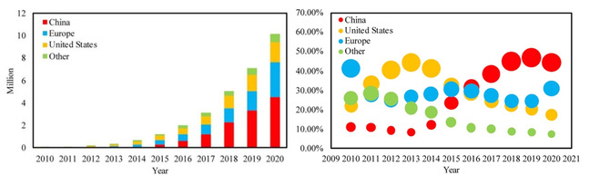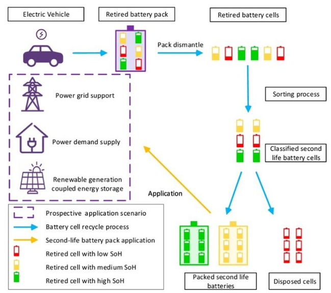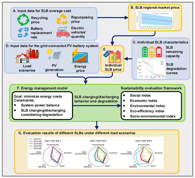 米兰新闻网5月8日电 随着国家对新能源电池支持力度的加大、民众环保意识的不断增强以及电池成本的降低,电动汽车(Electric Vehicle,EV)市场正在快速扩张。截至2021年底,全球电动汽车库存已超过1600万辆。尽管电动汽车可以为减少碳排放作出贡献,但如何处理数量巨大的“退役电池”是行业和政府面临的重大挑战。由于这些“退役电池”仍具有约80%的剩余容量,通过开发不同的梯次利用电池(Second-life Battery,SLB)的使用场景并后续进行材料回收,不仅可以提高电池的有效利用率,还可以降低新电池的制造成本,从而大大缓解行业和政府处理废旧电池的压力。同时,随着可再生能源技术的不断发展和应用,光伏加电池储能系统的使用越来越广泛,梯次利用电池恰恰是光储系统中“储”的一个很有潜力的选择。将梯次利用电池应用于并网光储系统时,需要对其可靠性、成本、可持续性进行评估。针对上述梯次利用电池评估、应用和回收领域,米兰milan官方网站深圳国际研究生院张璇、韦国丹、周光敏团队取得了一系列研究成果。