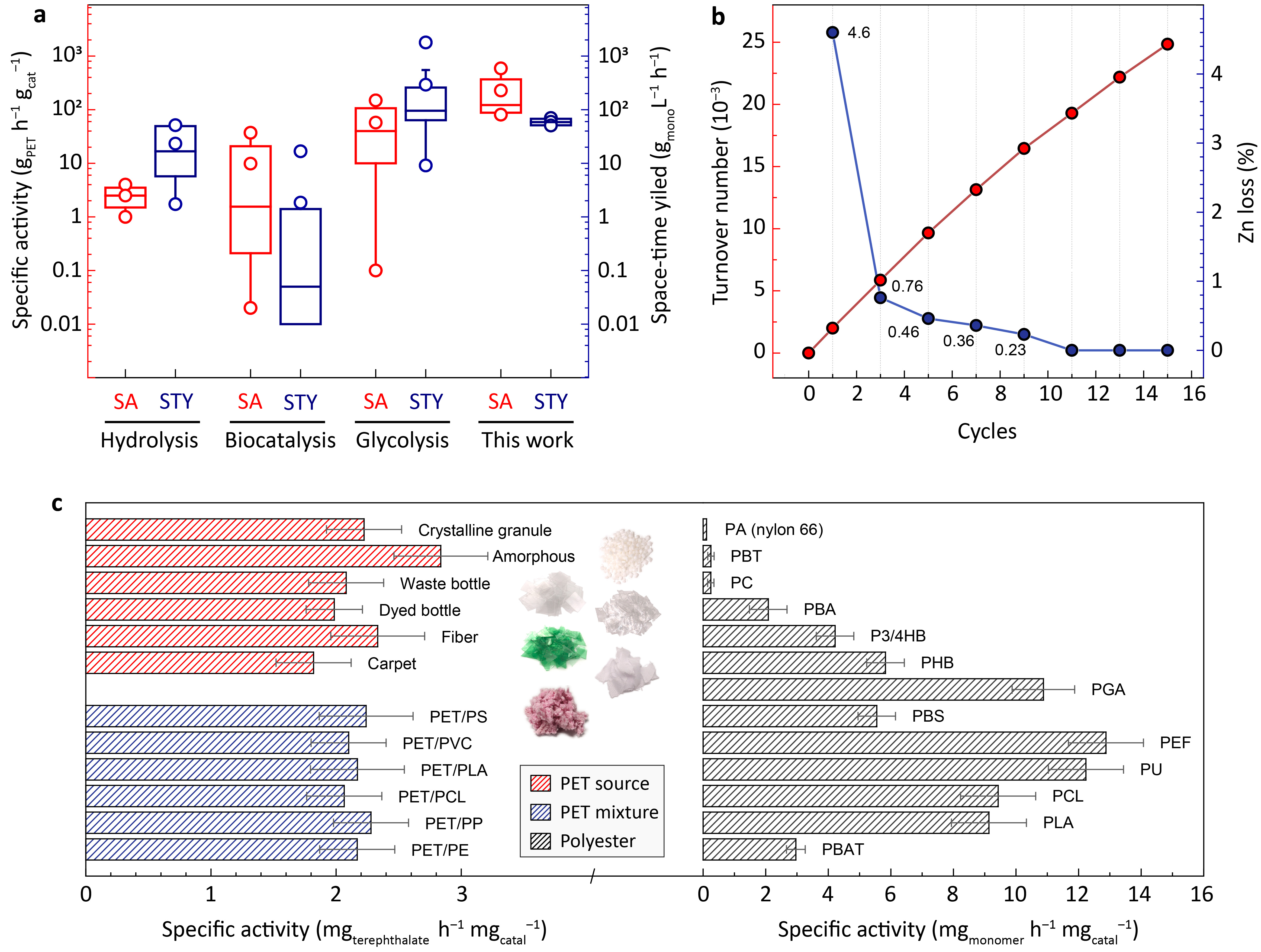 该双核催化剂的结构稳定性使其可在较广的操作温度(30−340oC)和pH(8−14)范围内进行使用。在相对温和的条件下(pH13和90oC),可达到577 gPETh-1gcat-1的比活性、70 gTPAL-1h-1的对苯二甲酸单体的时空收率,以及不低于25000的TON(图3a,b)。与传统PET碱性水解技术相比,在碱浓度降低10倍的基础上,催化剂的比活性提高了一个数量级(图3a)。此外,该催化剂对废弃塑料中各种添加剂和色素具有良好的耐受性,并对不同种类的聚酯塑料表现出普适性(图3c)。