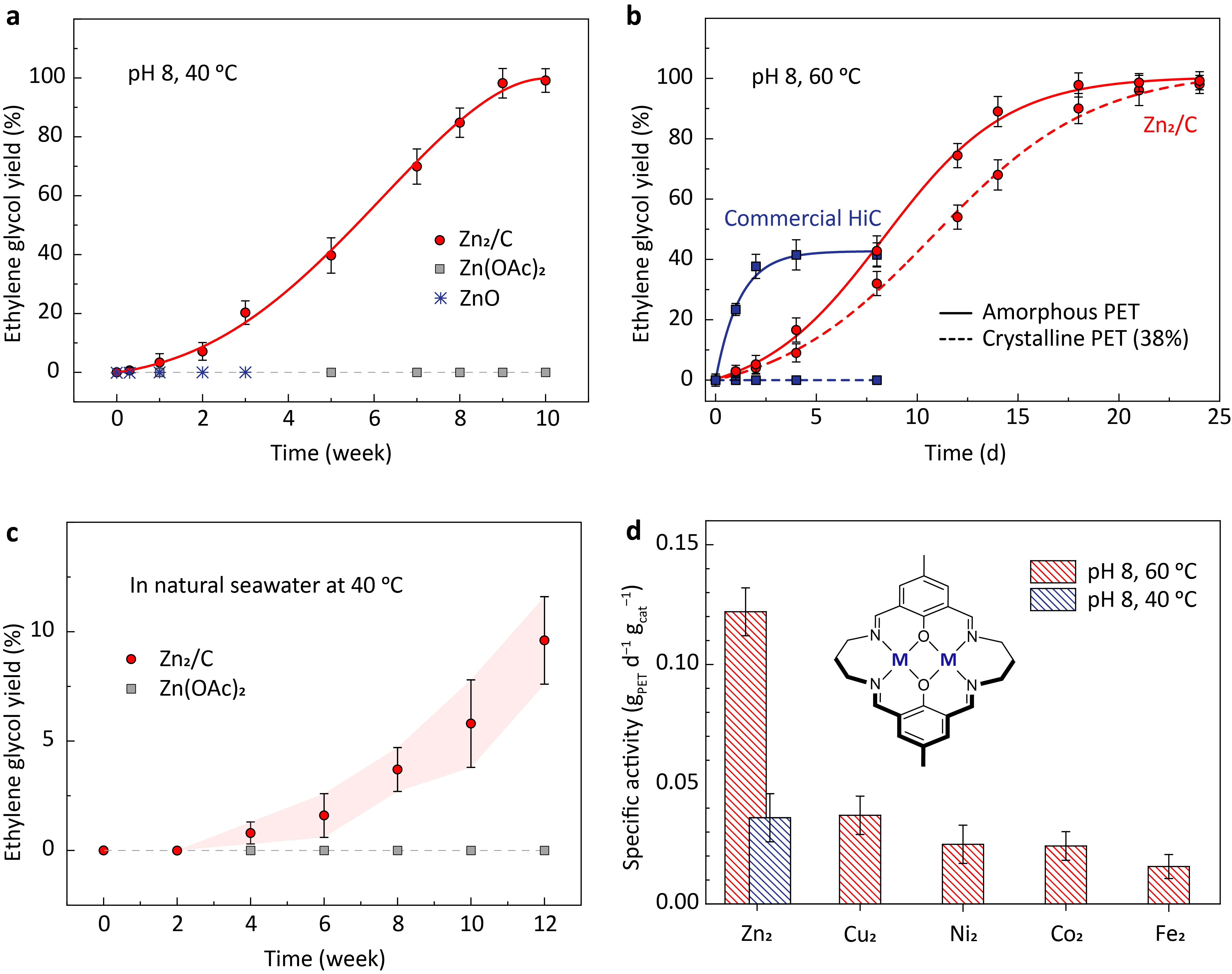 基于上述猜想,牛志强课题组发现了一种双核锌催化剂能在温和条件甚至环境条件下有效实现PET的解聚(图2a)。与PET水解酶相比,该催化剂具有稳定性好、成本低、塑料适用范围广的优点,打破了PET水解酶对高结晶度PET活性低的局限性(图2b)。该催化剂可在真实海水环境中(pH7.9)实现PET的持续解聚(图2c),为环境修复提供了可能。