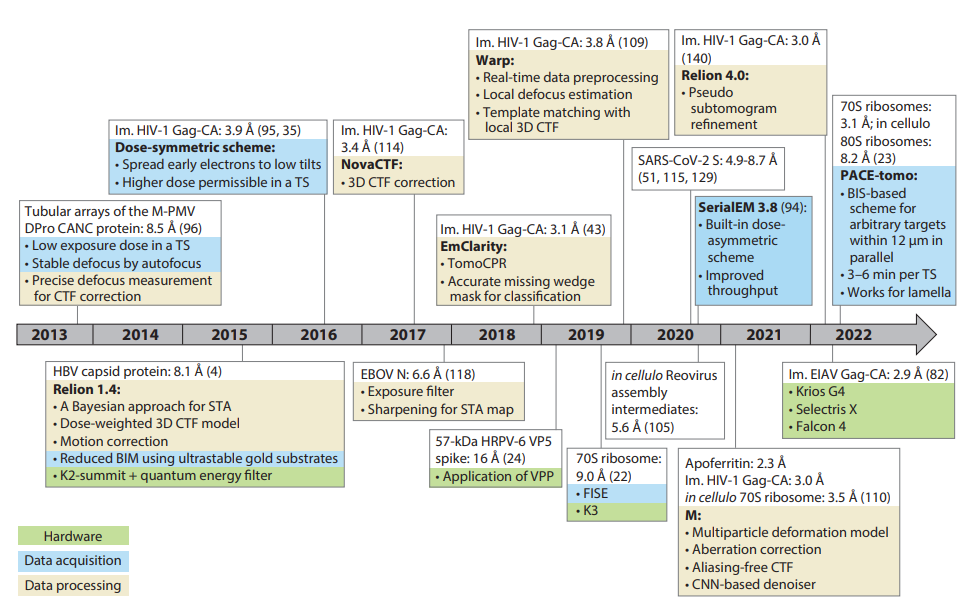 图2.“冷冻电镜分辨率革命”以来,cryo-ET近十年的分辨率发展。一系列重要的技术革新,推动了cryo-ET的分辨率革命