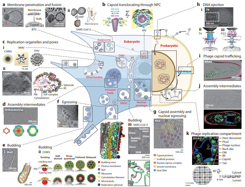 全面了解病毒在宿主体内的生命周期是病毒学研究的重中之重,基于此我们才能从中发现漏洞,筛选靶点,有针对性地开发抗病毒药物及抗体。从一颗病毒入侵宿主细胞到大量子代病毒的释放,病毒在细胞内的行为千差万别,花样繁多。曾几何时,我们关于病毒“生命周期”的理解,主要来自于传统功能学实验、荧光显微镜及常温切片电镜观测。然而,随着快速投入式冷冻制样、高压冷冻制样、冷冻光电联合成像(cryo-CLEM)、电镜可见的特异性生物标记、冷冻聚焦离子束减薄(cryo-FIB milling)、相位板(VPP)、基于人工智能的图像识别、降噪和图形分割等一系列cryo-ET相关技术的发展,病毒生命周期的“示意图”正逐步转变为“结构现实”。