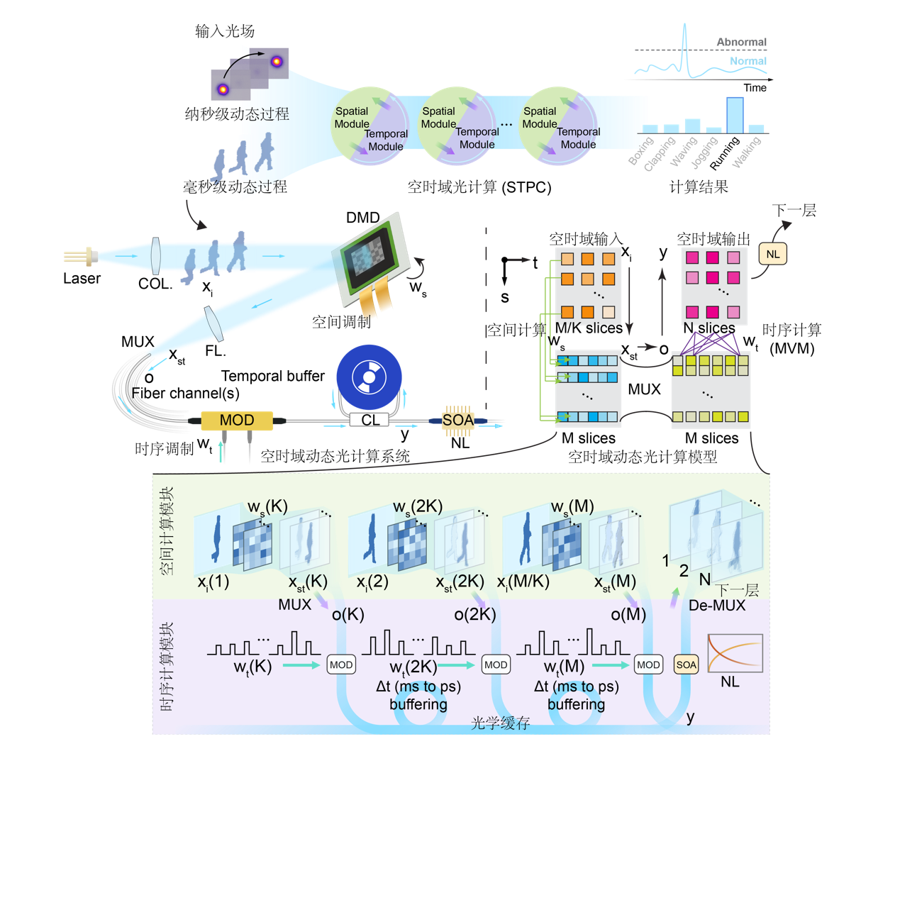 课题组通过刻画多维光场传播模型,首次建立空时域计算表征,同时在空间和时序维度完成连续光计算。针对空间光场和时序光场内在维度失配问题,提出空间复用和光谱复用计算模型,匹配空时域光计算维度。进一步建立时序矩阵乘加计算模型,扩展空时域光计算维度。所有空间和时序计算操作均在光学模拟域完成,因此空时域光计算的速度不受制于电子内存的传输和读写。该论文进一步提出了多变量全光非线性函数,成功构建多层非线性神经网络,支撑复杂视觉智能任务的高速推理。在多个视频数据集上的实验结果表明,空时域光计算能够将视频智能处理速度提升至数百兆赫兹量级,有望为后摩尔时代高性能智能计算以及瞬态科学现象的实时分析和控制等带来新的契机。