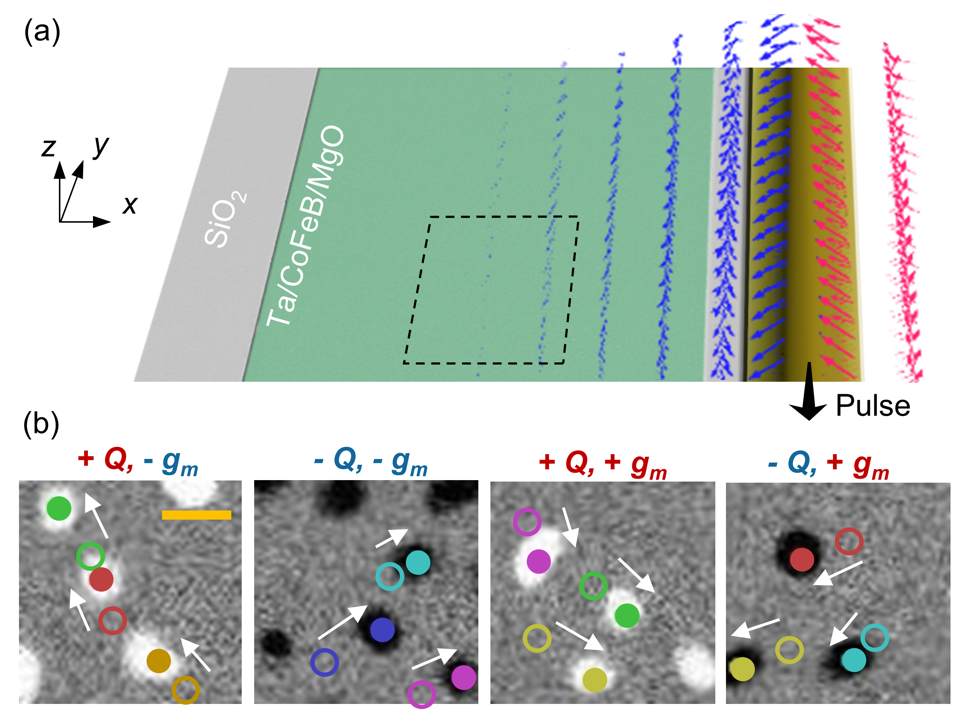 图2.斯格明子的片上类斯特恩盖拉赫实验。(a)用于产生奥斯特磁场以及梯度的器件照片(经过透视变形和上色)。(b)在图1所示虚线框内,利用极化磁光克尔显微镜,采集到相反拓扑荷(±Q)斯格明子在相反奥斯特磁场梯度(±gm)下的运动轨迹。空心圆(实心圆)标记在施加单个电流脉冲(∆t= 10微秒)之前(之后)斯格明子的位置。箭头的方向指示标记的斯格明子的运动方向。比例尺为5微米
