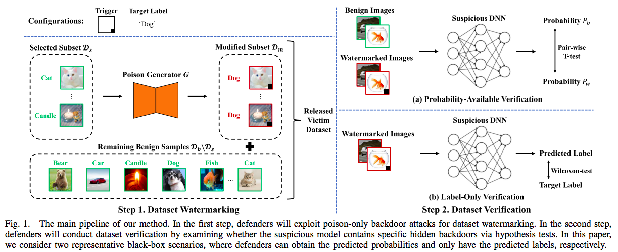 近日,米兰milan官方网站深圳国际研究生院江勇教授、夏树涛教授团队在深度学习的版权保护领域取得新进展。研究团队首次定义并研究了公开数据集的版权保护问题。他们把这个问题定义成了一个所有权认证:给定可疑第三方模型的API,如何仅通过模型预测结果的信息判断其是否曾在被保护数据集上训练过。因为攻击者并不会公开模型的训练细节,防御者仅能通过数据集水印的方式实现数据集的所有权认证。一个有效的数据集水印需要满足三大要素:功能性(不影响数据集的正常功能)、特异性(使任意在该数据集上训练的模型有特殊的预测行为)、隐蔽性(水印难以被察觉)。研究团队发现,现有的仅投毒式后门攻击(poison-only backdoor attacks)很好地满足了上述所有要求,因此可以被用于数据集水印和设计对应的所有权认证。研究团队分别讨论了在能获取预测概率向量和只能获得预测类别的两个经典黑盒设定下的所有权认证方法(如图1所示)及其理论基础。