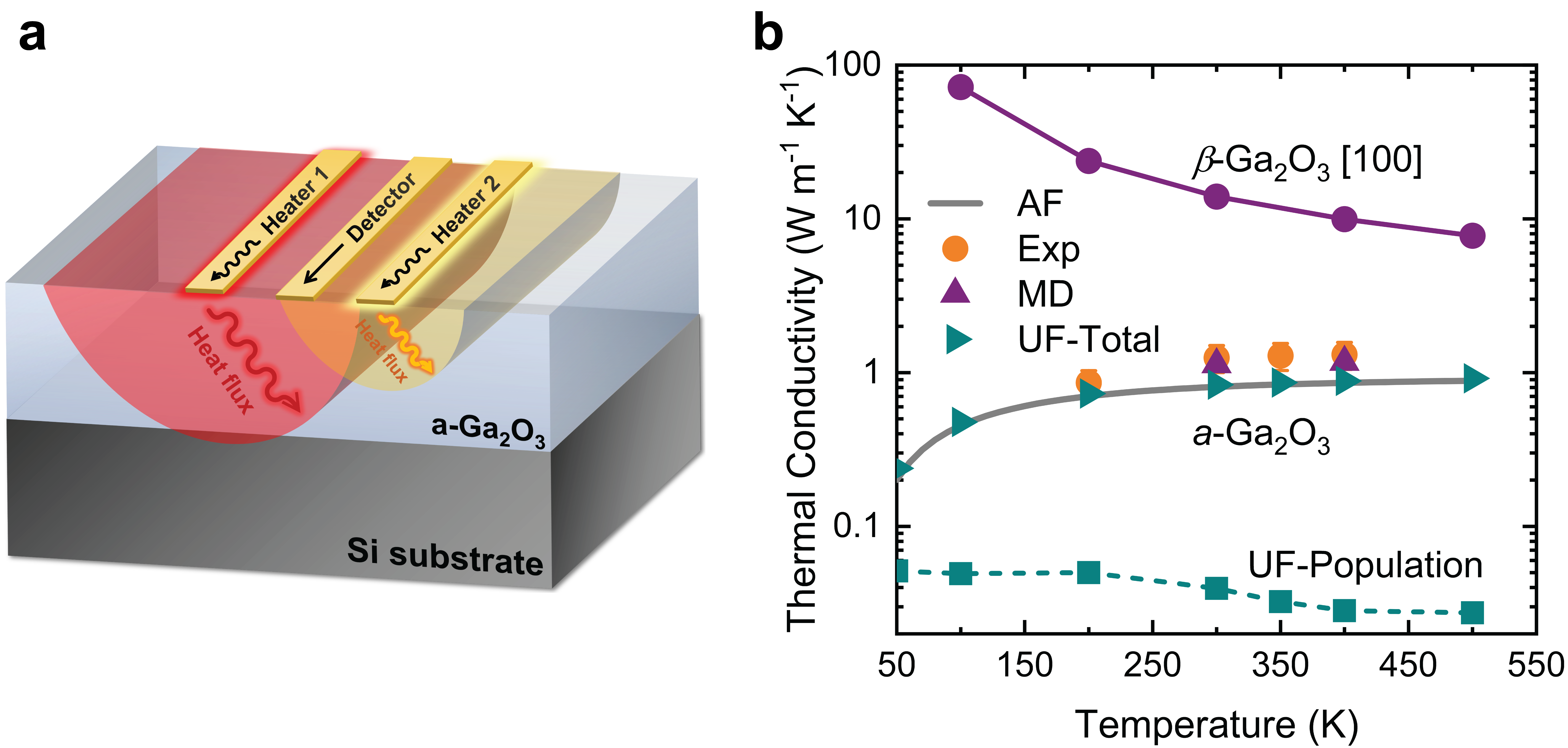 图1.非晶氧化镓热导率的实验测量结果与理论预测值对比