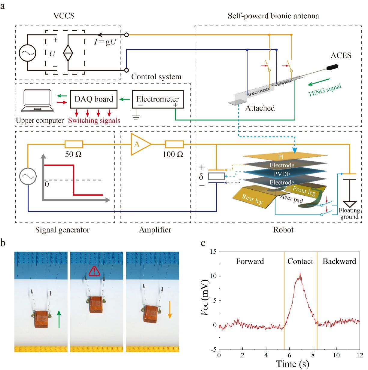 仿生触角感受器由银纳米线包覆的多孔弹性体(ACES)为原材料制成,文中探究了ACES的制备工艺、导体性能和摩擦电性能。当感受器部分与外界环境中的物体进行接触时,与外界物体之间形成单电极式摩擦纳米发电机进行信号输出,反映感受器与外界环境的接触状态以及接触物的材料属性。执行器单元由聚对苯二甲酸乙二醇酯(PET)薄膜骨架和形状记忆合金(SMA)弹簧构成,赋予仿生触角水平方向和竖直方向的运动自由度,使得感受器部分可以进行自主检测动作,实现主动感知。单个仿生触角的重量约为70mg,并在体积和集成性上与微型机器人相匹配。