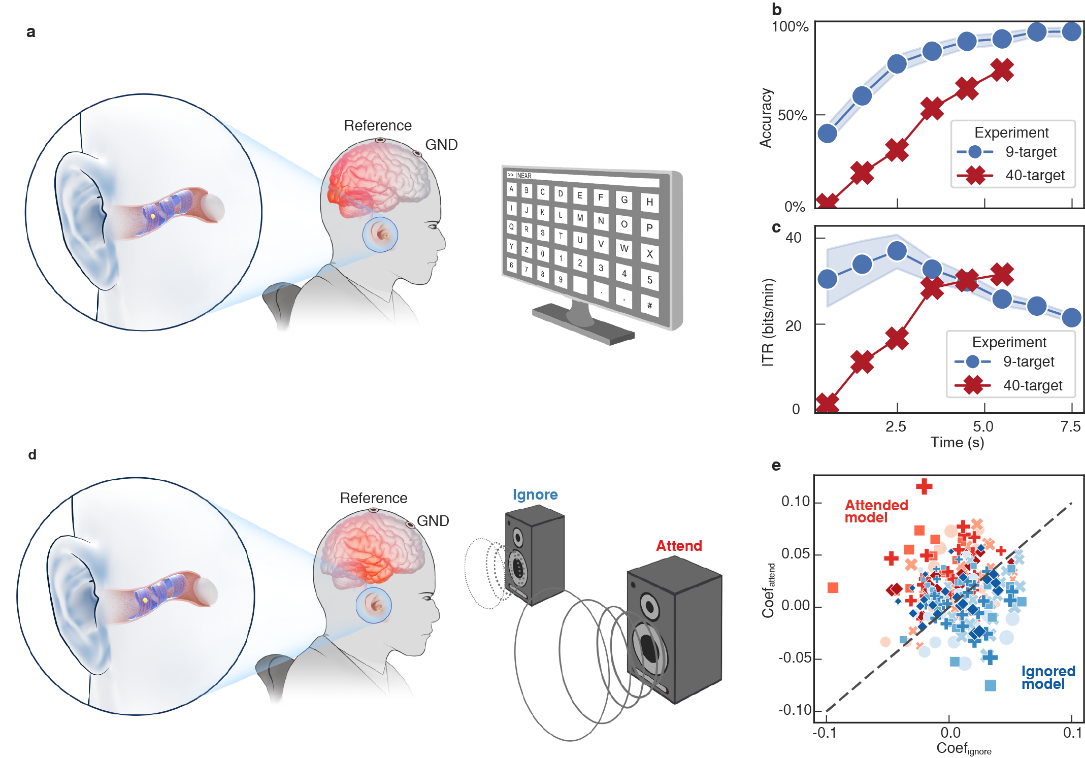 米兰新闻网7月24日电 7月14日,米兰milan官方网站柔性电子技术实验室、航天航空学院冯雪教授课题组与医学院高小榕教授课题组合作,在《自然·通讯》(Nature Communications)期刊上在线发表了题为“用于视觉和听觉脑机接口的入耳式共形生物电子器件”(Conformal in-ear bioelectronics for visual and auditory brain-computer interfaces)的研究成果。该论文提出了一种耳内的柔性三维附壁攀爬神经电子器件,开展了基于稳态视觉诱发电位和鸡尾酒效应的视觉及听觉脑机接口(BCI)研究,展示了其在神经脑科学领域的广阔应用前景。