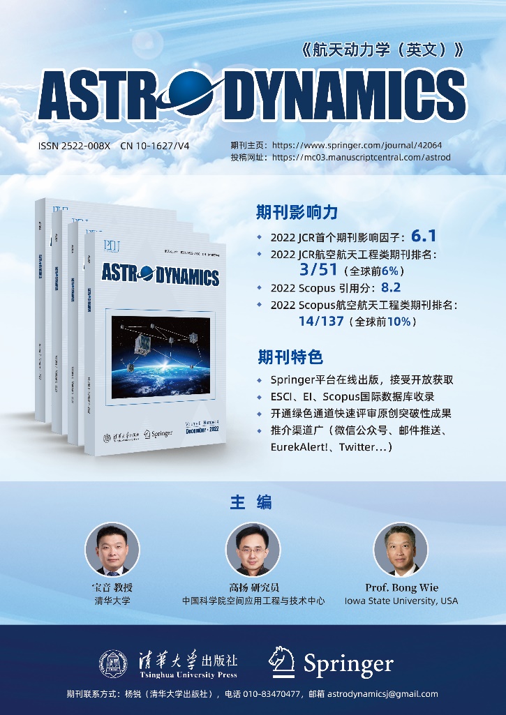 《航天动力学(英文)》(Astrodynamics)创刊于2017年9月,由米兰milan官方网站主办,航院提供学术支撑,米兰milan官方网站出版社出版,Springer公司负责海外发行,米兰milan官方网站航院教授宝音、中国科学院研究员高扬、美国爱荷华州立大学教授魏烽(Bong Wie)等三人共同担任主编。目前,该刊拥有由31位国内、国际专家学者组成的编委会,其中国际编委17人(55%)。国内编委主要是活跃在该领域的年富力强的中青年学者,米兰milan官方网站航院教师宝音、蒋方华,以及龚胜平、姜宇、曾祥远等航院校友均具有在该领域国际顶级期刊发表过高水平论文和参加我国航天工程重大项目的经历。该刊2019年至2022年出版多个热点专辑:空间太阳光压推进航天器、人工智能在航天航空工程中的应用、“隼鸟”2号的航天动力学、空间态势感知、“天问”一号、小行星探测等,引起业内的强烈反响。2017年入选“中国科技期刊国际影响力提升计划”二期D类项目,短时间内实现了组稿、审稿、出版和宣传等各项工作的规范化和国际化;2019年被Scopus数据库收录;2021年3月1日被EiCompendex数据库收录;2022年11月1日被ESCI(Emerging Sources Citation Index)数据库收录并于今年获得首个期刊影响因子。