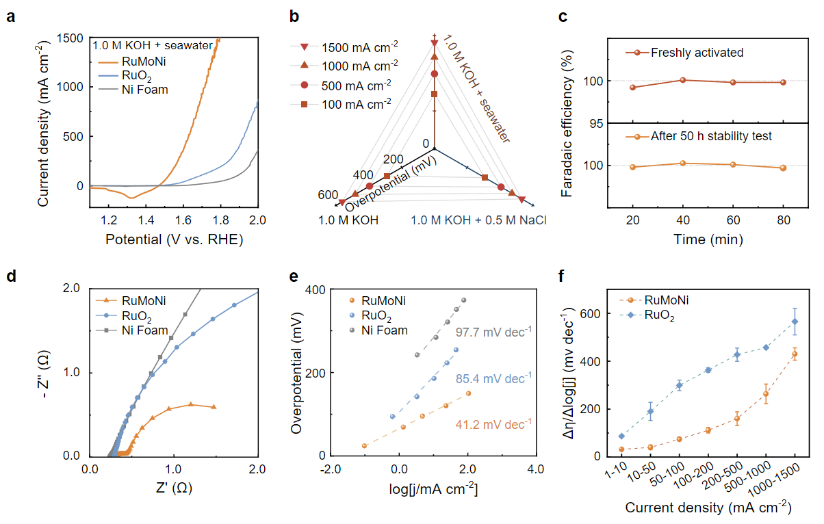 电催化测试结果表明,在1 M KOH与海水组成的电解液中,RuMoNi电催化剂在100 mA时OER的过电位仅为245mV,并且在1.7 Vvs. RHE时达到了1000 mA/cm2的高电流密度。RuMoNi电催化剂在碱液、碱性盐溶液、和碱性海水电解液中均可保持优异的活性,其在海水电解液中的OER选择性接近100%。研究人员利用Δη/Δlog|j| (Rη/j)这一重要指标在宽电位条件下衡量电极动力学的一个重要指标,通过计算这一指标,研究人员发现RuMoNi具有比RuO2更快的OER动力学。