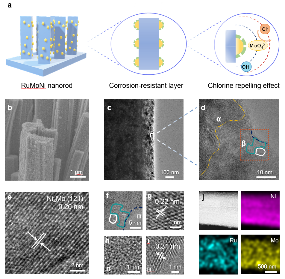 近日,米兰milan官方网站深圳国际研究生院刘碧录教授团队开发了一种高性能、耐腐蚀海水电解催化剂。研究人员通过水热法和电化学活化法制备了钌钼镍(RuMoNi)催化剂,这种催化剂由表面多孔纳米棒阵列组成。高分辨透射电镜表明该催化剂由镍钼合金(Ni4Mo)导电基底、氧化钌/羟基氧化镍(RuO2/NiOOH)活性相和钼酸镍(NiMoO4)抗腐蚀层构成。