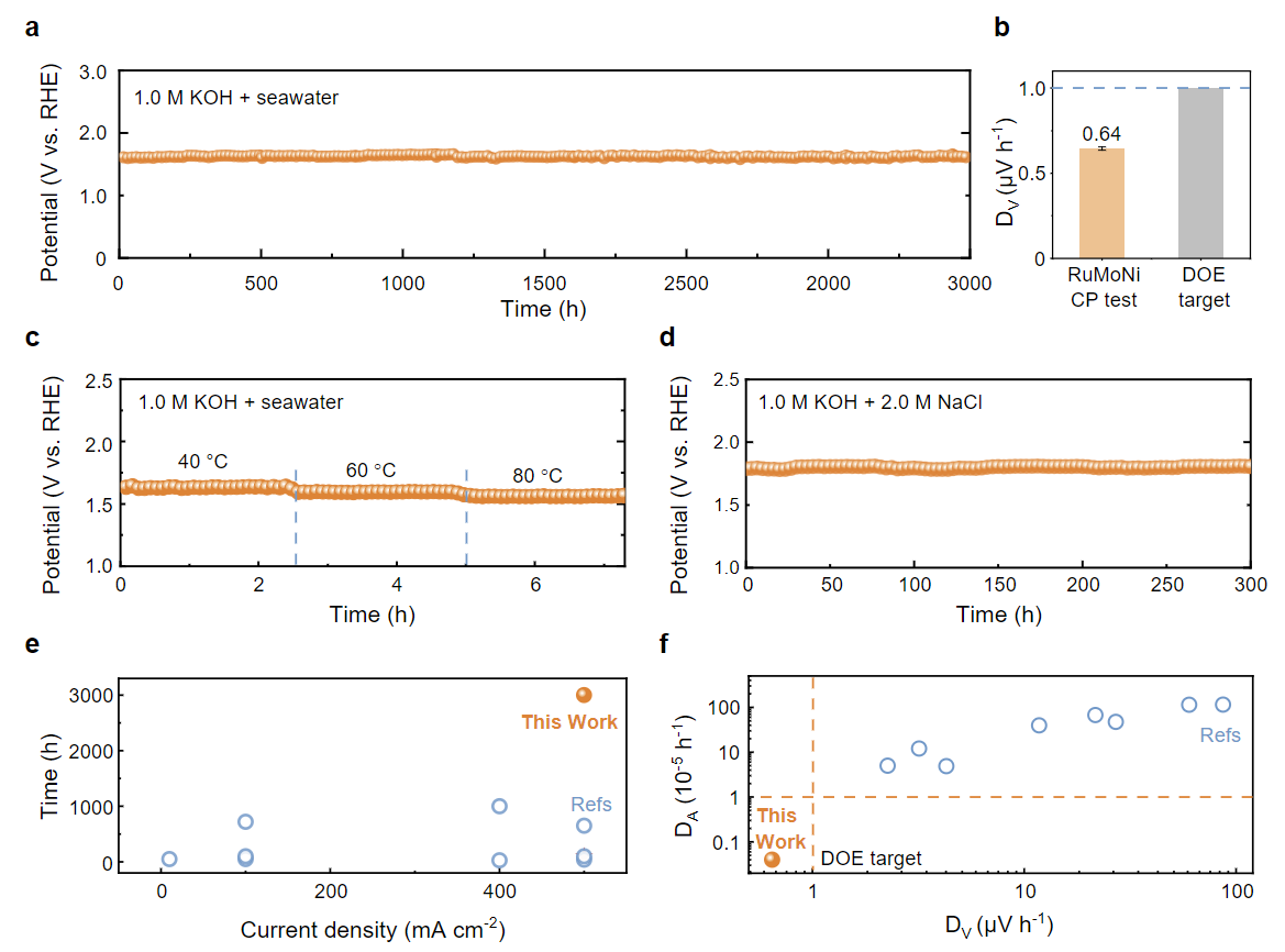 海水的强腐蚀性对电催化剂的耐久性带来了重大挑战。研究人员测试了RuMoNi催化剂的长期稳定性,该催化剂可在500 mA/cm2的电流密度下稳定运行3000小时。同时,团队提出了客观衡量催化剂稳定性的指标——电压衰减率(