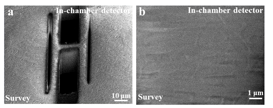 图2.默认状态下利用扫描电镜观察样品形貌(左)与FIB减薄后的平面(右)