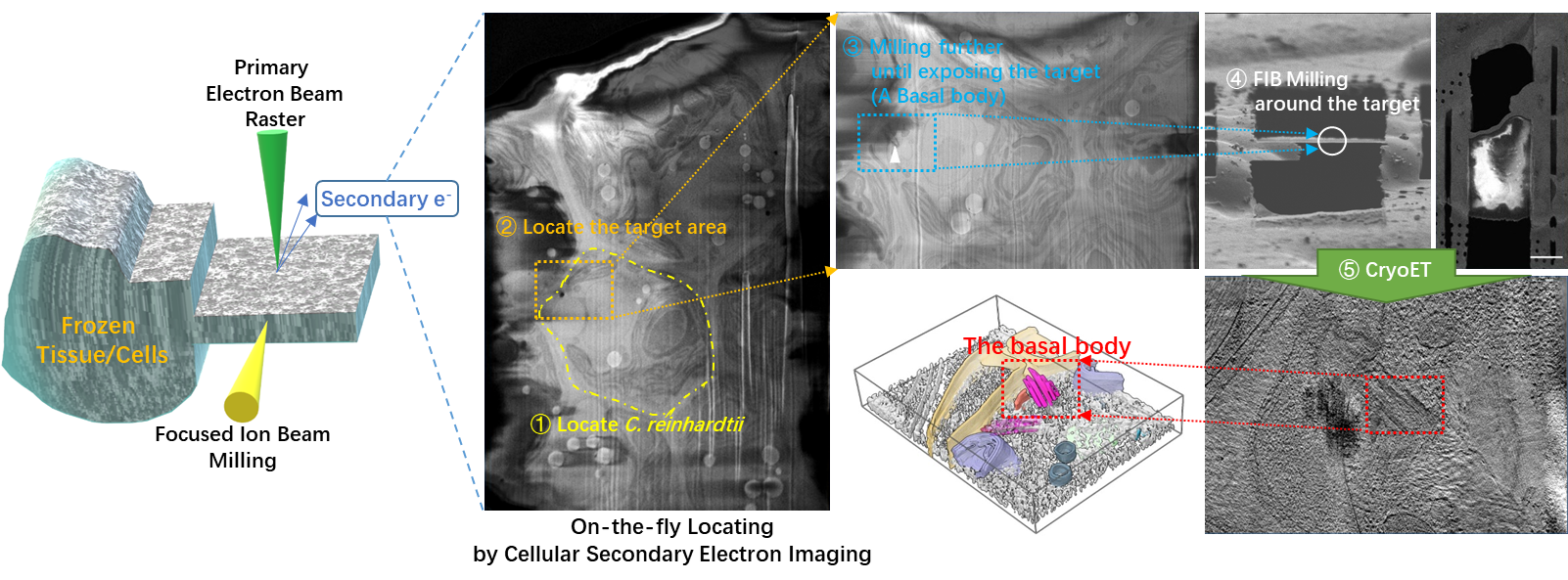 最后,该研究以衣藻的基体(basal body)为定位对象,建立了简单的切割-定位流程。使用CSEI技术定位时,从样品单侧进行减薄,每次FIB减薄后,都使用CSEI技术进行定位。CSEI技术可以实现在切割过程中进行持续实时成像和精确三维定位。