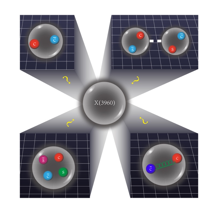 此次发现的X(3960),如果将其解释为粲偶素家族中的一员,那么它的质量将比其自旋轨道耦合三重态的“大哥”Xc2(3930)和“二哥”Xc1(3872)的质量均大,这是一件不可思议的事。其次,近来有学者把X(3960)和Xc0(3915)看作同一个粒子,如果其是常规粲偶素,根据2023版粒子数据表(Particle Data Group),此粒子到OZI(Okubo-Zweig-Iizuka)压低的J/Ψω的分宽度竟然还比到OZI允许的D+D-和Ds+Ds-的分宽度还大,显然是不合理的。比较可能的解释是,它是夸克组分为[c cbar s sbar]的四夸克态,或者[c cbar s sbar]与常规粲偶素的混合,前者跟理论预言的最轻的组分夸克为[c cbar s sbar]的粒子吻合。此外,此粒子也可能是两介子分子态、夸克胶子混杂态,或者上述任意两者的混合等。对于诸如X(3960)等奇特强子性质的研究,有助于深入理解强力和探索物质的基本结构。