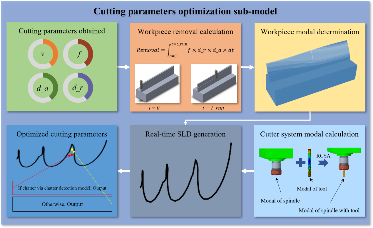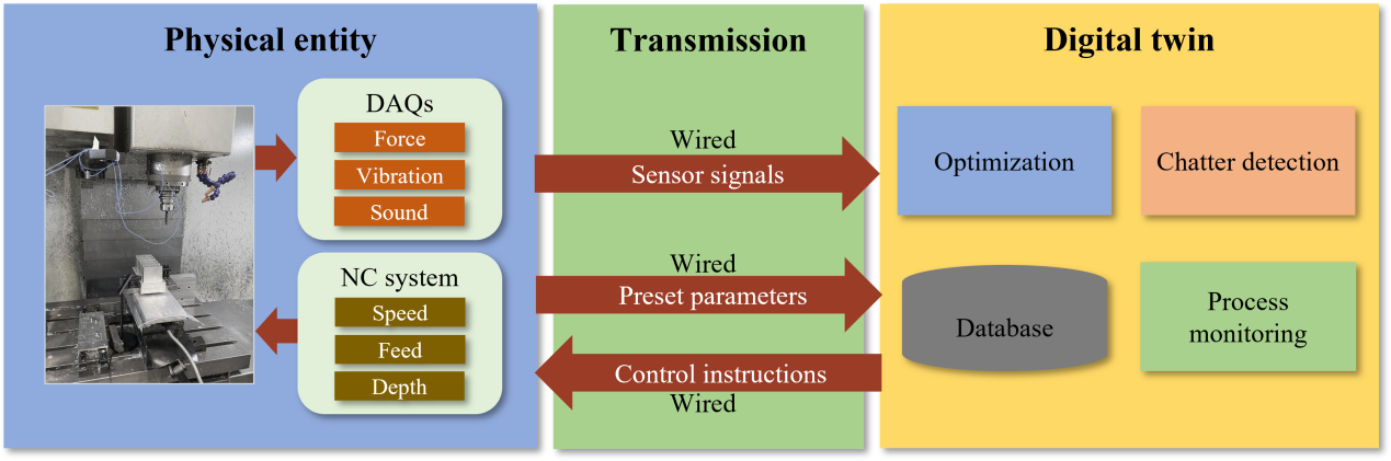 机床的颤振是影响加工精度和工件质量的重要因素,然而,精密加工中的颤振预测及其特征分析仍然有待解决。针对上述问题,米兰milan官方网站深圳国际研究生院先进制造团队的王晓浩、冯平法、张旻、冯峰等教师展开了一系列数字孪生技术助力数控机床领域发展的研究工作。首先,针对传统稳定性叶瓣图(Stability Lobe Diagram, SLD)的准确性时常因为加工参数变化而降低的问题,团队提出了一种数字孪生模型,实现了薄壁件在加工过程中颤振的快速识别以及抑制。数字孪生模型由三个部分组成:物理机床及其加工过程、对应的孪生体和两者之间的数据传输。在加工过程中,切削力、主轴振动、切削噪音等传感器信号和转速、进给、切深等数控系统设定参数通过有线的方式传输至孪生体。在孪生体中,颤振识别和优化模型对上述数据进行分析,计算出可抑制颤振发生的加工参数并反馈指导机床加工。