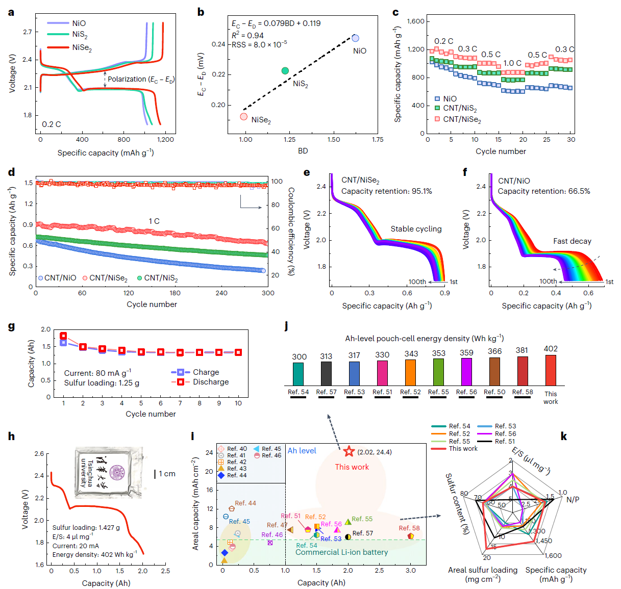 研究人员通过充放电曲线循环、低温器件性能等测试,验证了TMC催化剂中非金属对器件性能的影响。NiSe2具有适中IBand和ILatt,对应适中的吸附能力和低反应能垒,可防止催化剂表面毒化,保持长循环期间的催化活性。受益于优异的催化效应,基于NiSe2组装Ah级锂硫软包电池可实现402Whkg-1高能量密度,在相对较低的贫电解液条件下(4μLmg−1)下可发挥24.4mAhcm−2的超高面积容量,优于之前报道的大多数Ah级Li-S软包电池。
