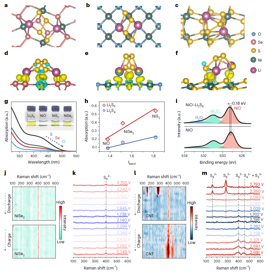 结合密度泛函理论计算、紫外可见吸收光谱与原位拉曼测试,研究人员验证了电子效应描述符的理论预测结果。IBand较低的TMC催化剂,对于多硫化锂具有更高的吸附能力。