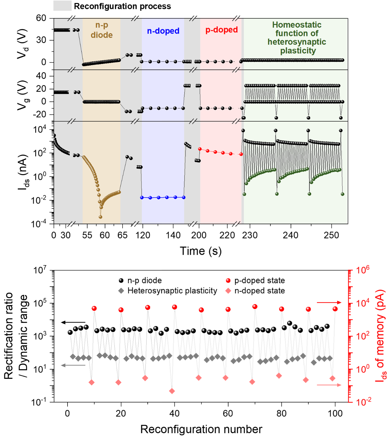 研究人员进一步展示了可重构MoTe2器件的连续重构能力。该器件可以在多种可重构功能之间连续切换,并且在经过100次的重构后,依然保持性能稳定(图4)。