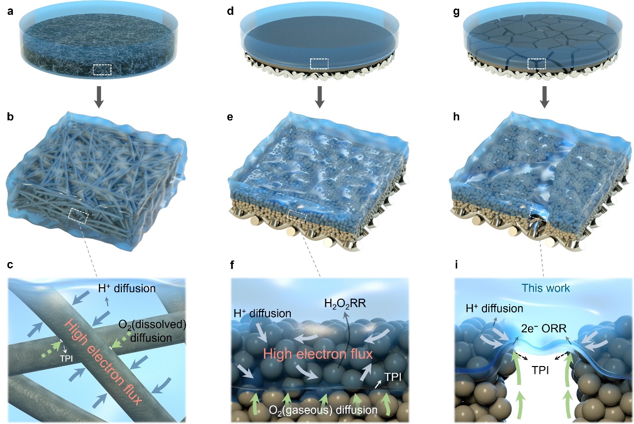 米兰新闻网12月4日电 过氧化氢(H2O2)是现代化学工业的基石之一,同时也是潜在的能源载体,具有广泛的应用范围,例如增值化工产品合成以及清洁水生产等。电化学双电子氧还原反应(2e−ORR)代表了一种经济且可持续的分布式按需生产H2O2的未来战略,适用于从大规模化学品生产到小型便携式卫生设施的潜在应用。气体扩散电极(GDE)被公认为是目前最有前途的2e−ORR电极架构平台,其允许气态反应物直接从供给端输送至反应性气-液-固三相界面(TPI)而无需预先溶解到电解质中。然而,由于高电流密度操作条件下的快速电润湿对气体扩散电极反应性三相界面造成的破坏性淹没,使得H2O2电合成工艺的工业转化面临选择性低和耐久性差的重大挑战。