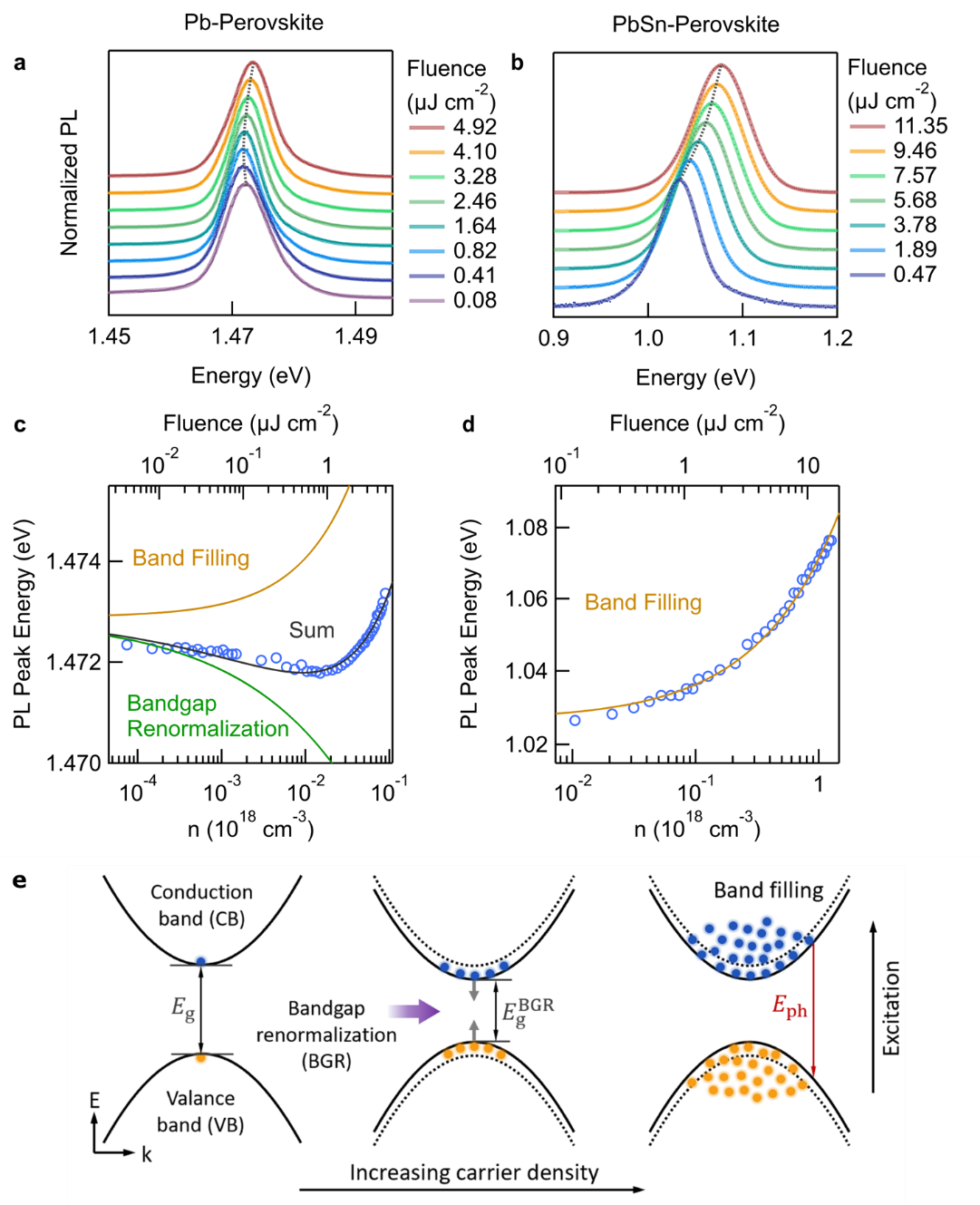 米兰新闻网12月4日电 有机-无机杂化钙钛矿是一种新型半导体材料,因其具有优异的光电性能和结构可调性,成为近年来太阳能电池领域的研究热点。能带带隙是决定光伏特性的重要参数,它容易受到温度和光注入载流子浓度的影响。钙钛矿带隙的温度效应在以往研究中使用传统半导体中的晶格热效应解释。然而,传统半导体晶格相对坚硬,钙钛矿具有柔软灵活的结构,而且容易出现晶格热畸变。这些效应在过去的研究中未被考虑。此外,在以往的钙钛矿带隙随光注入载流子浓度变化的研究中,只有能带填充效应在荧光光谱中被直接观测到,一种同样重要的带隙重整化效应还未在荧光光谱中被发现,从而没有被重视。