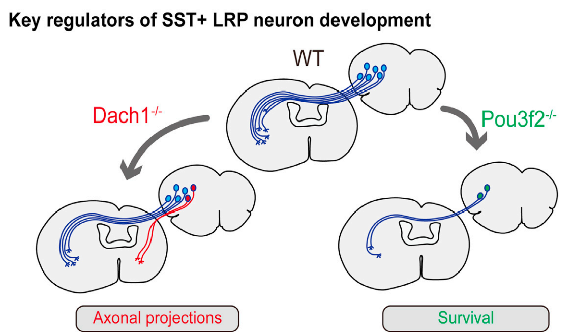随后,研究人员根据SST神经元发育轨迹的分析,指出早在胚胎发育时期,SST神经元内部已经建立两支截然不同的发育轨迹——其一为形成长程投射的LRP神经元,另一为形成局部投射的中间神经元(图2)。针对胚胎时期已获得细胞命运的LRP神经元亚型进行分析,研究人员发现特异性富集表达于LRP2亚型神经元的转录因子Dach1以及富集表达于大部分LRP神经元的转录因子Pou3f2。