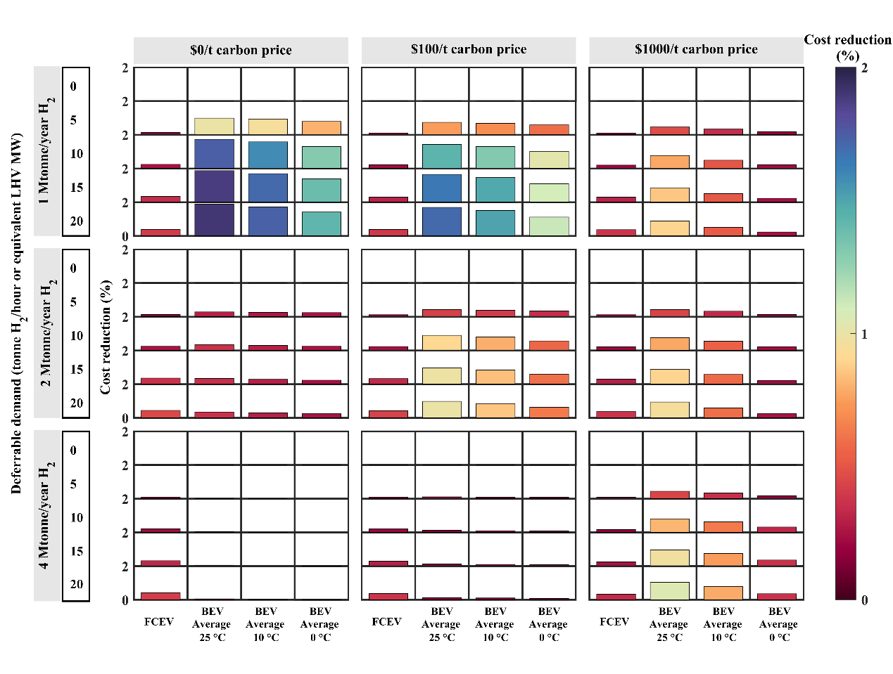 图4.不同温度下,电动汽车和燃料电池汽车在各场景中的灵活性价值对比