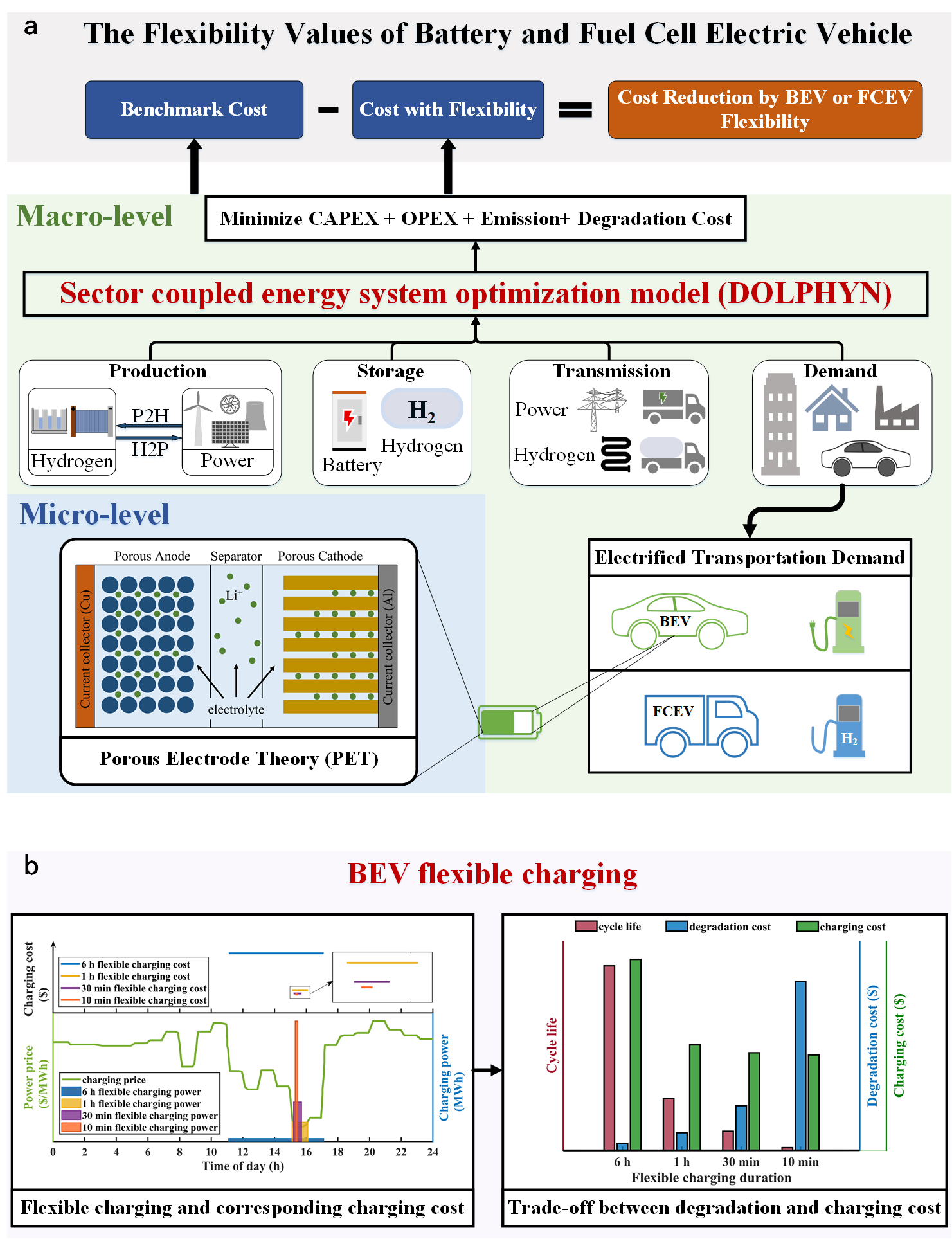 该研究将电动汽车和燃料电池汽车对低碳能源系统的灵活性价值量化为电动汽车灵活充电和燃料电池汽车灵活加氢对能源系统最低成本的降低值。通过跨尺度优化模型分别优化能源系统参数和调度,得到电动汽车和燃料电池汽车灵活充电或加氢前后系统的最低成本,进而量化得到两种交通电动化途径对低碳能源系统的灵活性价值。特别之处是,为考虑不同温度和充电速率下电动汽车电池退化引起的成本增加,基于电池微观多孔电极模型仿真计算不同使用工况下电动汽车电池的容量衰降,并转化为电池退化成本计算进能源系统多行业耦合的宏观优化模型中。使用提出的跨尺度优化模型,设置包括不同电池充电模式、电池使用温度和替换成本、不同政策(如不同氢能源发展途径和碳价格)等的多个场景分析电动汽车和燃料电池汽车在为低碳能源系统提供灵活性价值方面的相对优劣。
