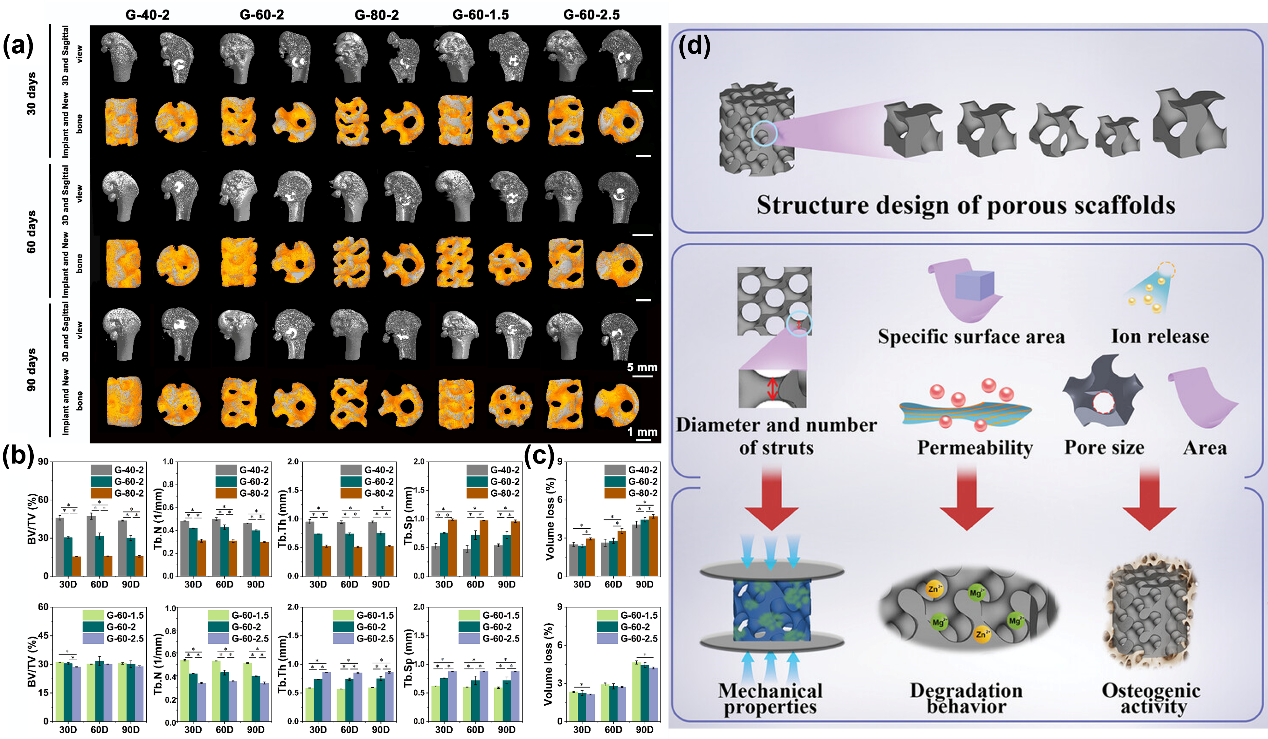 因肿瘤切除或严重创伤等造成的大范围骨缺损是临床治疗上的棘手难题,需要在形态不规则的骨缺损处填充骨植入物完成特定修复功能。锌是人体必需的生命元素,其人体内含量在所有金属元素中排序第六,世卫组织推荐健康成年人每天需摄取锌15mg。锌能够在人体内安全降解,消除了植入物长期存在的隐患;适量的锌离子可促进骨再生,同时起到抗菌消炎效果。然而,过快的降解导致承载不足,且局部过量的锌离子对骨代谢有不利影响;过慢的降解则无法形成骨组织完全修复重建。因此,调控骨植入物的降解速率,使之与骨重建需求匹配并提升骨再生疗效是目前可降解锌合金临床应用的技术瓶颈。温鹏课题组通过医工交叉合作,利用增材制造技术制备了可降解锌合金多孔支架,并从合金成分、孔隙设计和表面涂层多个方面调控了其降解行为,揭示了降解机制及其对骨再生的影响,并在动物试验上实现了良好的促成骨效果。