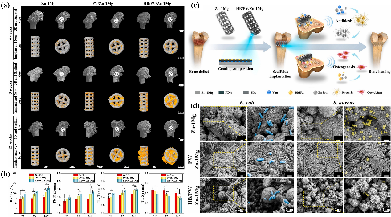 镁的加入虽然有利于提高生物活性和成骨能力,但随着镁含量增加,Zn-Mg合金塑性降低,强度先升高后降低,Zn-1Mg表现出良好的综合力学性能,更适于有承载需求的骨缺损填充支架。通过在纯锌和Zn-1Mg多孔支架表面制备负载抗菌药物万古霉素(Van)和具有骨诱导功能的生长因子BMP2的羟基磷灰石(HA)/聚多巴胺(PDA)复合涂层,有效提升了锌合金多孔支架的抗菌及成骨能力(图2)。与裸支架相比,复合涂层支架有效抑制了植入早期Zn2+的快速释放,负载了Van和BMP2的HA/PDA复合涂层在体内外试验中均表现出优异的生物相容性、成骨活性以及抗菌能力,有望解决骨缺损修复过程中高发的感染问题以及复杂情况下的骨重建再生难题。相关研究成果以“一种改善Zn-1Mg多孔支架可降解骨植入物成骨和抗菌性能的药物负载复合涂层”(A drug-loaded composite coating to improve osteogenic and antibacterial properties of Zn-1Mg porous scaffolds as biodegradable bone implants)(论文2)和“用于治疗感染性骨缺损的含载药涂层的生物可降解锌支架的体内外研究”(In vitro and in vivo studies on biodegradable Zn porous scaffolds with a drug-loaded coating for the treatment of infected bone defect)(论文3)为题,分别发表于《生物活性材料》(Bioactive Materials)和《今日材料生物》(Materials Today Bio)期刊。