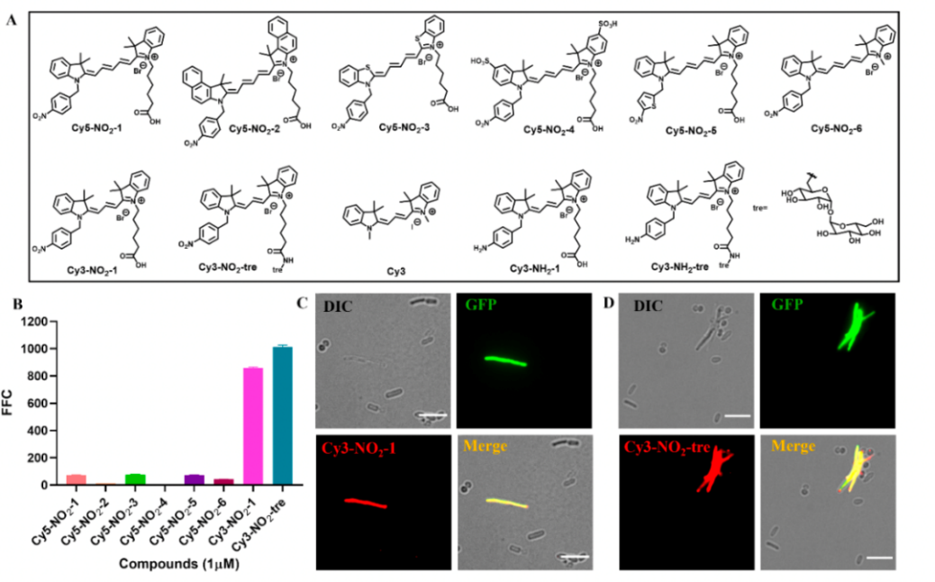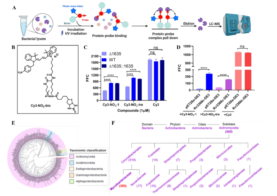 该研究设计合成了一系列的花菁类荧光探针,并确定荧光强度最高的Cy3-NO2-tre为最终荧光试剂。Cy3-NO2-tre自身不发光,但在细菌内可被特异的硝基还原酶Rv3368c还原后开启荧光。Cy3-NO2-tre可以选择性标记不同种属混合菌中的Mtb,而不会对其他的细菌产生荧光标记(图1)。课题组采用Pull down实验技术鉴定了Cy3-NO2-tre作用靶点—Rv3368c,并通过比较Cy3-NO2-tre在Rv3368c基因敲除、回补分枝杆菌菌株内、过表达Rv3368c大肠杆菌DE3的荧光强度得到验证(图2)。基于NCBI的生物信息学分析结果表明,Rv3368c主要表达于结核分枝杆菌科。