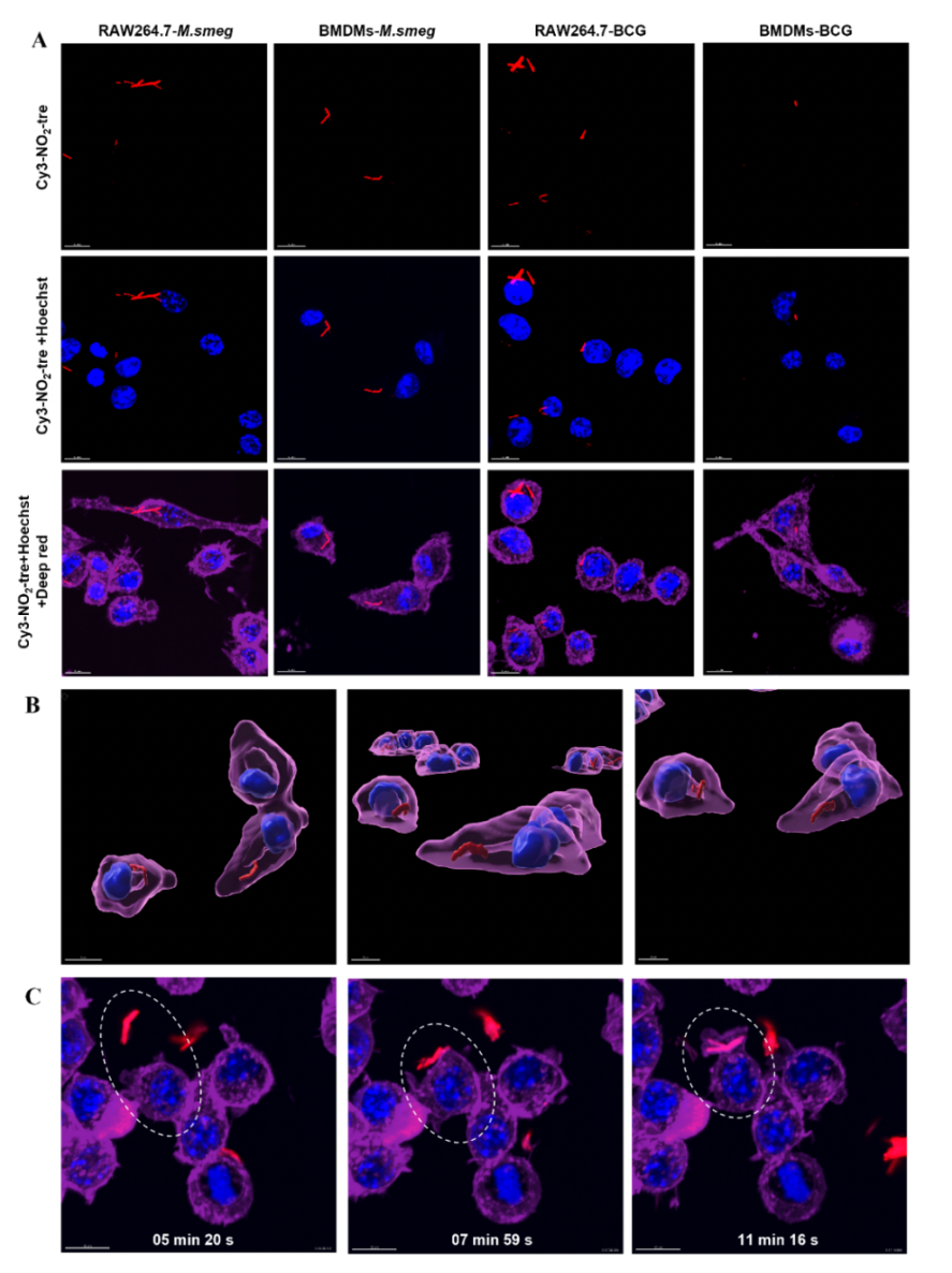 图3.Cy3-NO2-tre跟踪Mtb与宿主细胞的相互作用