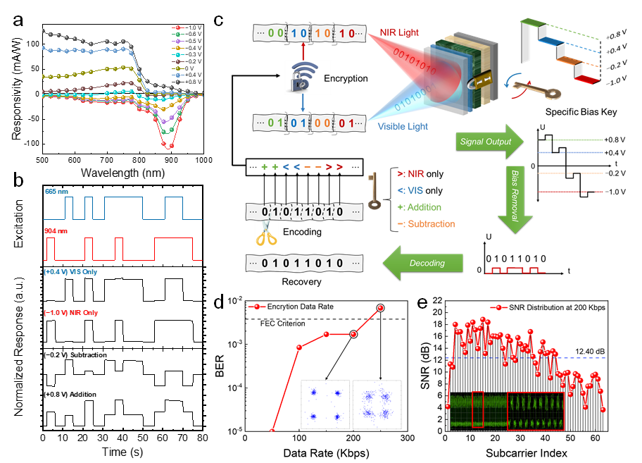 近日,米兰milan官方网站深圳国际研究生院付红岩副教授、韦国丹副教授团队利用可见光-红外双波段探测器成功建立了基于波分复用的多用户通信和加密通信系统,无需光学滤波元件,仅基于探测器自身工作电压的调制编码,即可实现可见光信息和红外信息的同步接收。此外,团队使用基于接收波长的调制电压产生加密密钥,可实现了双波长加密通信。
